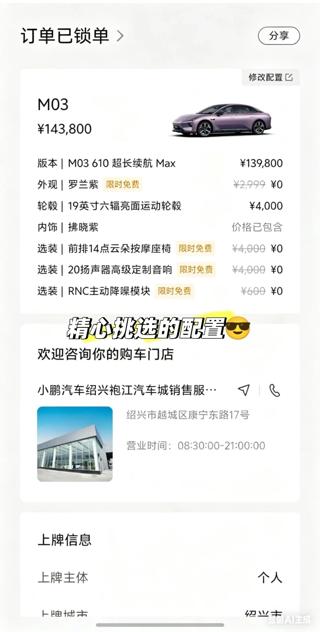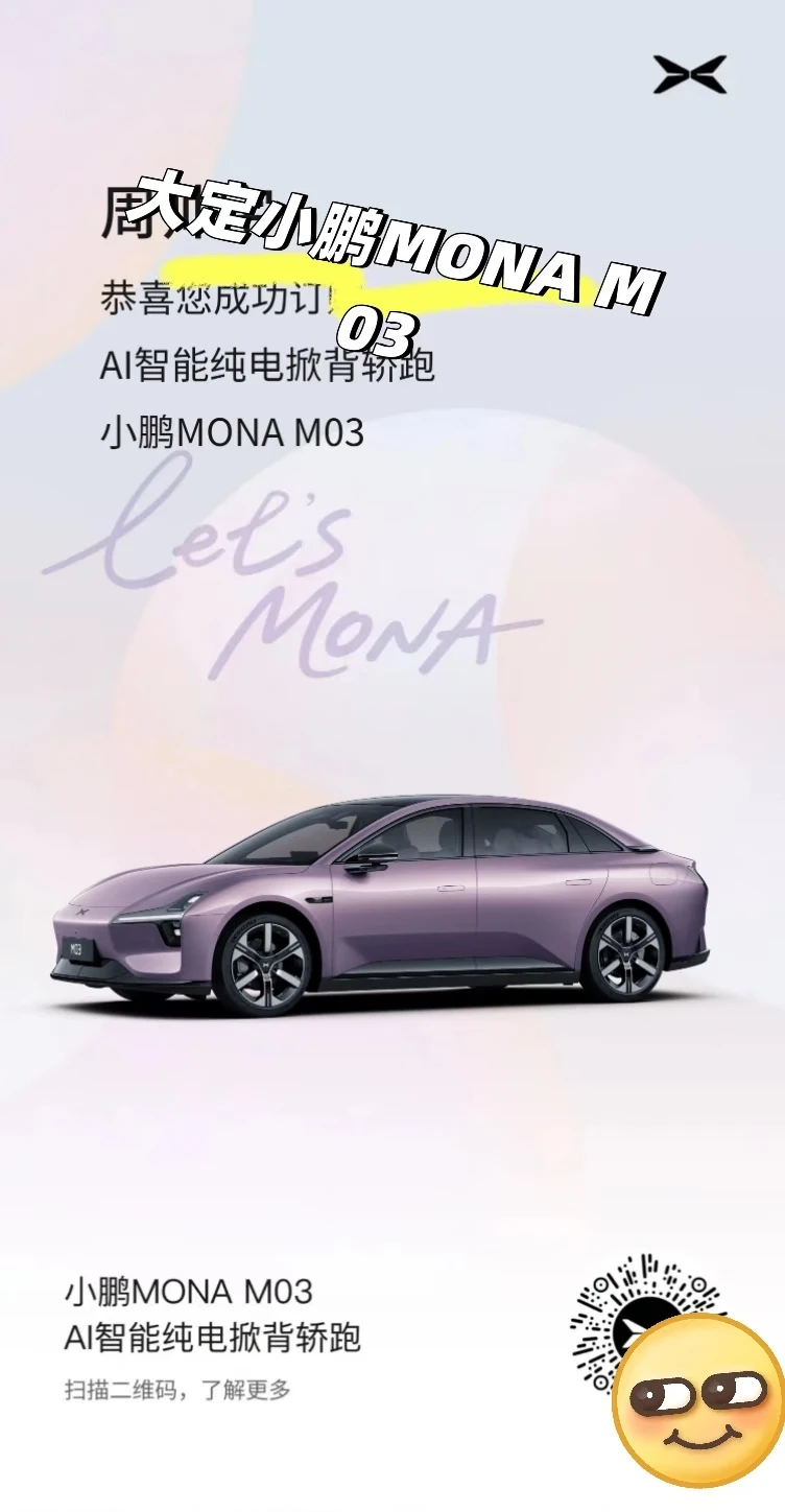 #小鹏MONA M03# 终于锁定小鹏MONA M03啦!作为小鹏忠实粉丝,一看到2026款MONA纯电轿跑就直接心动,果断下手锁单!颜值长在我审美上,轿跑造型超拉风,续航、智驾全都在线,日常代步、出门自驾都完全够用,性价比直接拉满。同时对比了好几款同级别车,还是MONA M03最合我心意,不管是配置还是驾驶感受都没得挑,坐等提车,已经开始期待开着它出门兜风啦!@社区活动小姐姐 @鹏友大管家 @小鹏友