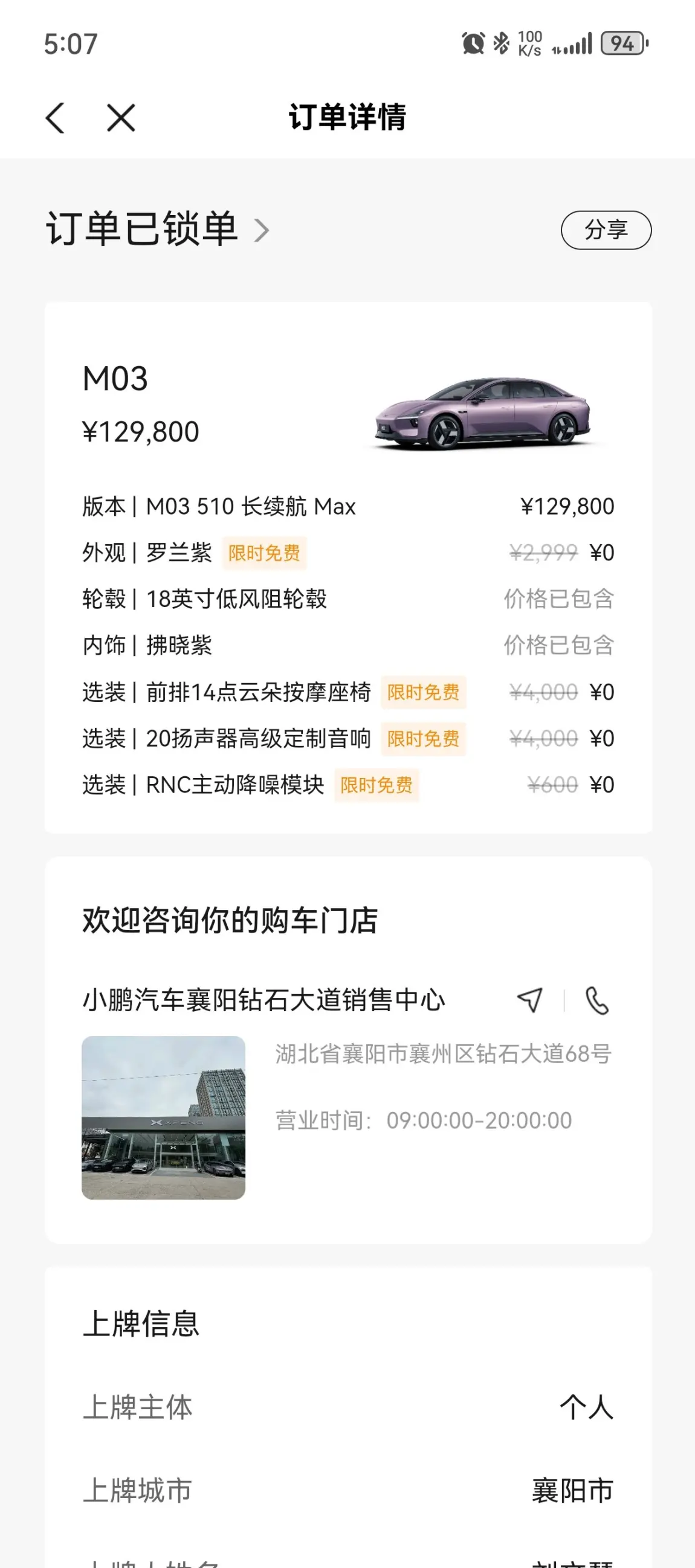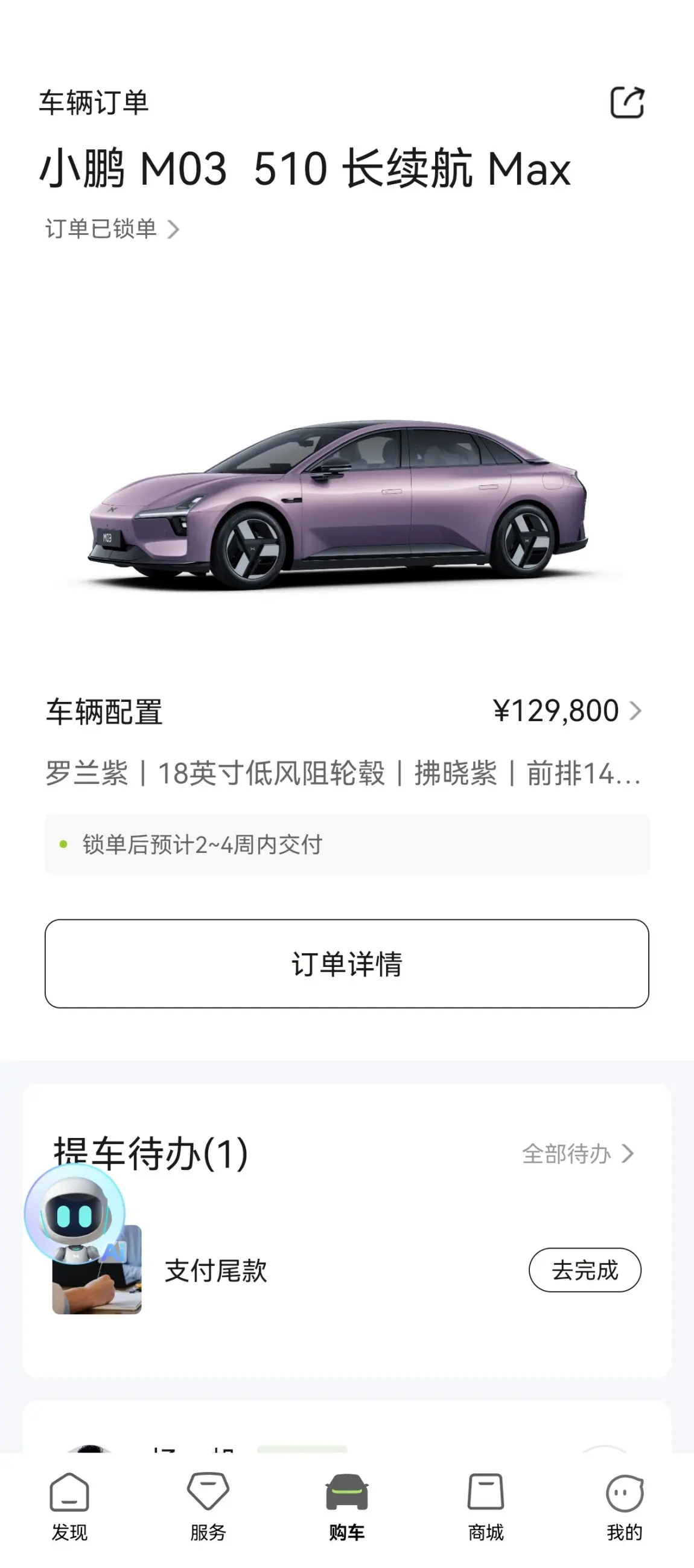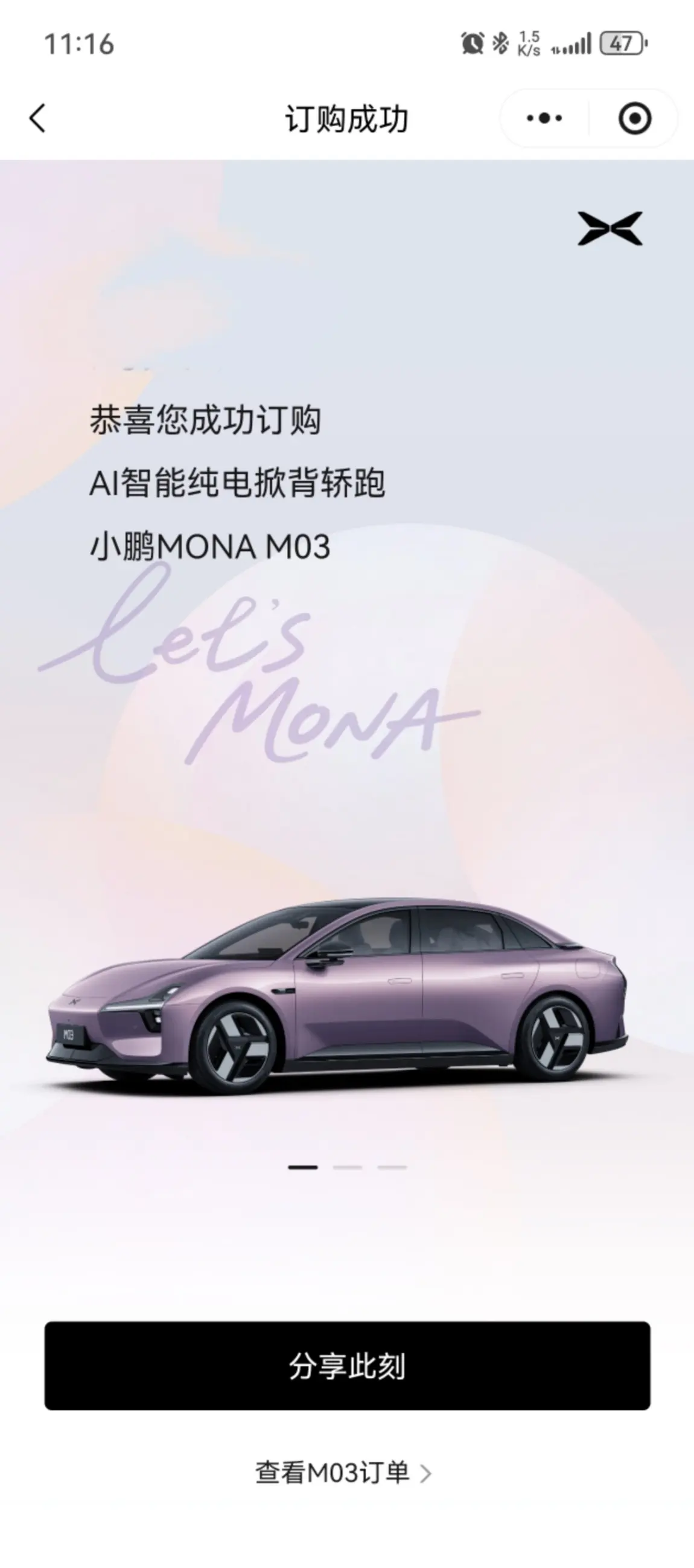2026年4月5日第一次见了我的紫色女孩,当时就被吸引到了,9日便来到4S店下单锁单了,提完车后,美美的吃了一顿,就等配车了。小车选了罗兰紫的外观+拂晓紫内饰很适合年轻人🧑,最吸引我的就是智驾功能,小鹏作为国产智驾top one的存在在10万级别的车型中,智驾还有人车共驾加入,安全更是提升了一个台阶😌,小鹏M03的颜值可以说是同级别车辆的颜值担当,续航我选择了510max,每天通勤50公里,电耗10个左右,完全够用✌✌✌✌✌✌#小鹏MONA M03# 第二代VLA#