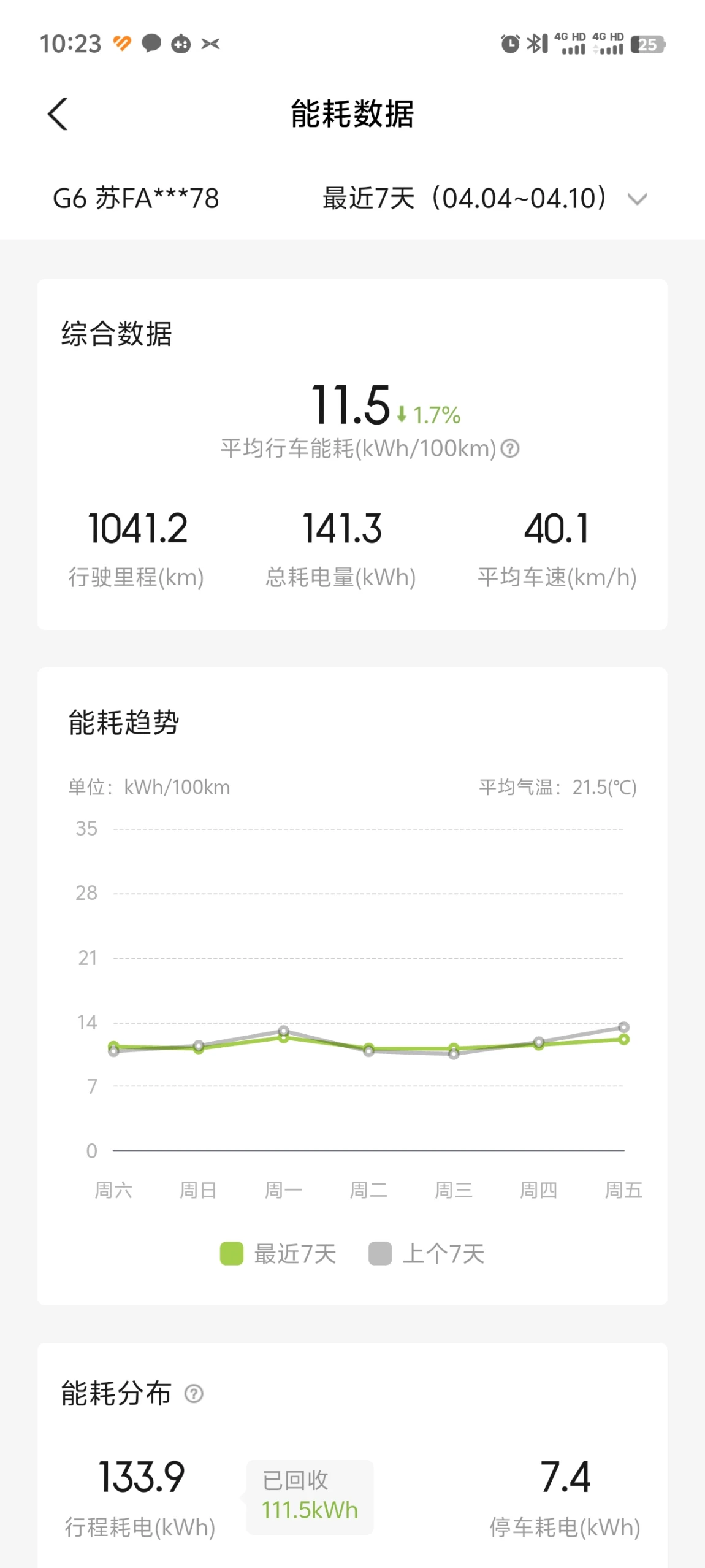 日常通勤百公里能耗稳定在11-12kWh,高速也能跑到14.8。最近7天累计行驶1041.2公里,平均行车能耗11.5kWh/100km。靠单踏板模式7天回收了111.5kWh电量,相当于白嫖了近四分之三电量!