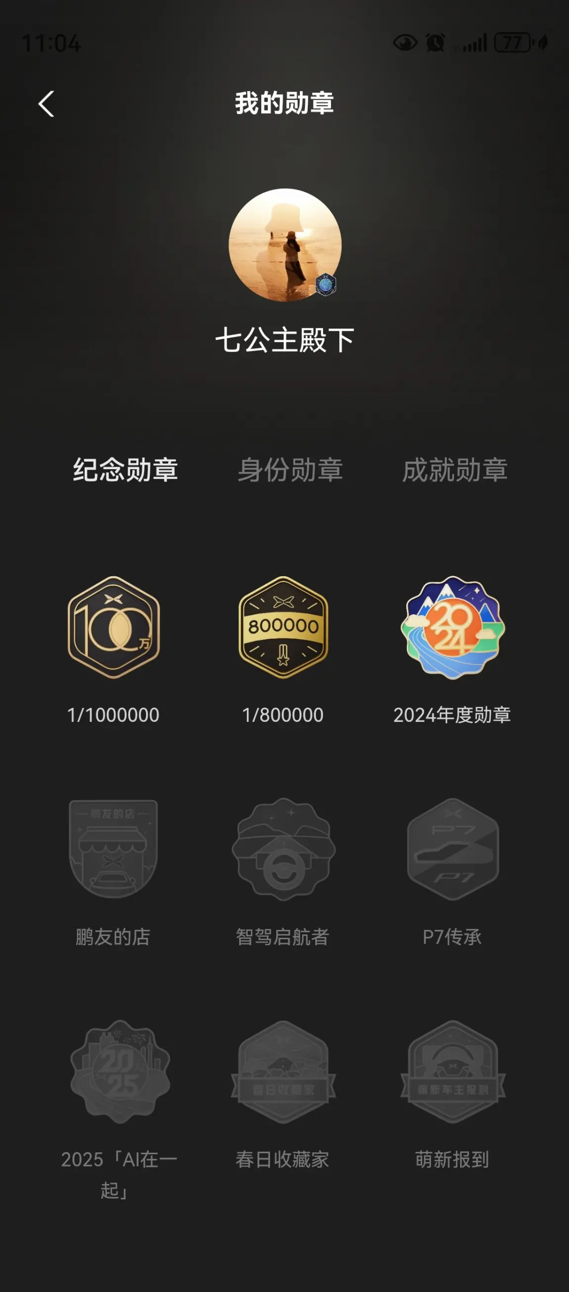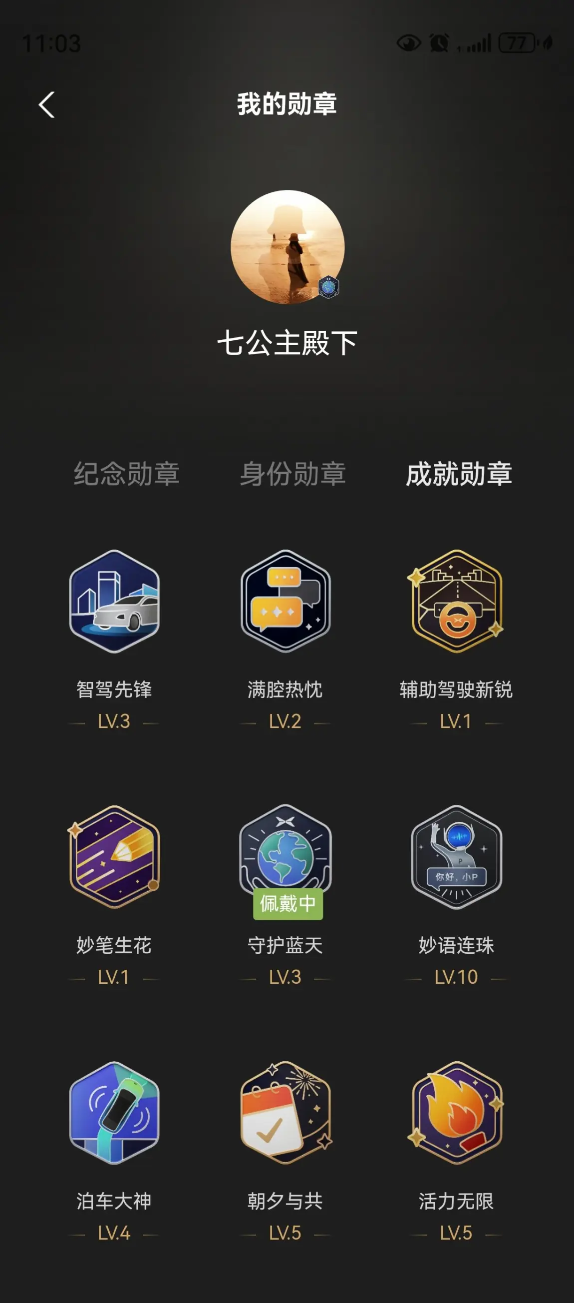 提车一年多,获得15枚勋章,记录着与小鹏的点点滴滴。美好时光温柔了岁月,希望继续陪伴你成长。
