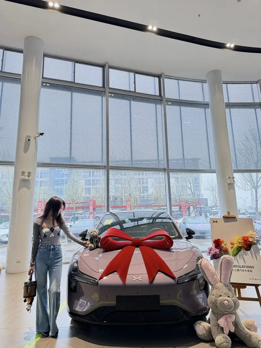 🚗提车那天阳光正好,淡紫车身在光下像一颗晶莹荔枝🍧,触感顺滑得让人心动~蝴蝶结🎀+鲜花💐仪式感直接拉满!