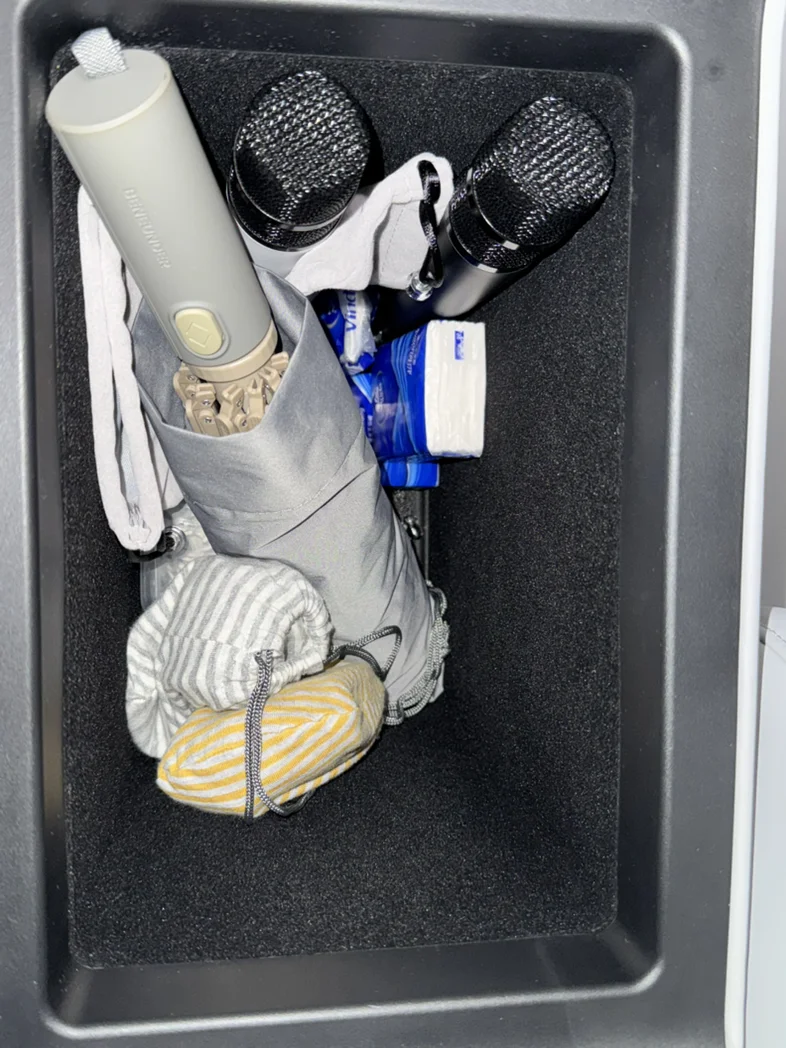 #我的移动储物间# 我的扶手箱里面放了折叠伞,纸巾,麦克风,睡觉的眼罩,驾驶证,牙线,手机充电线。伞比较长,斜方刚刚放得下。其他物件就往里面塞了,也不塞太满,不然拿取不方便。车门就放太阳眼镜和湿纸巾。座椅后面弄了两个挂钩,可以挂一下袋子,袋子里面放了件薄外套。