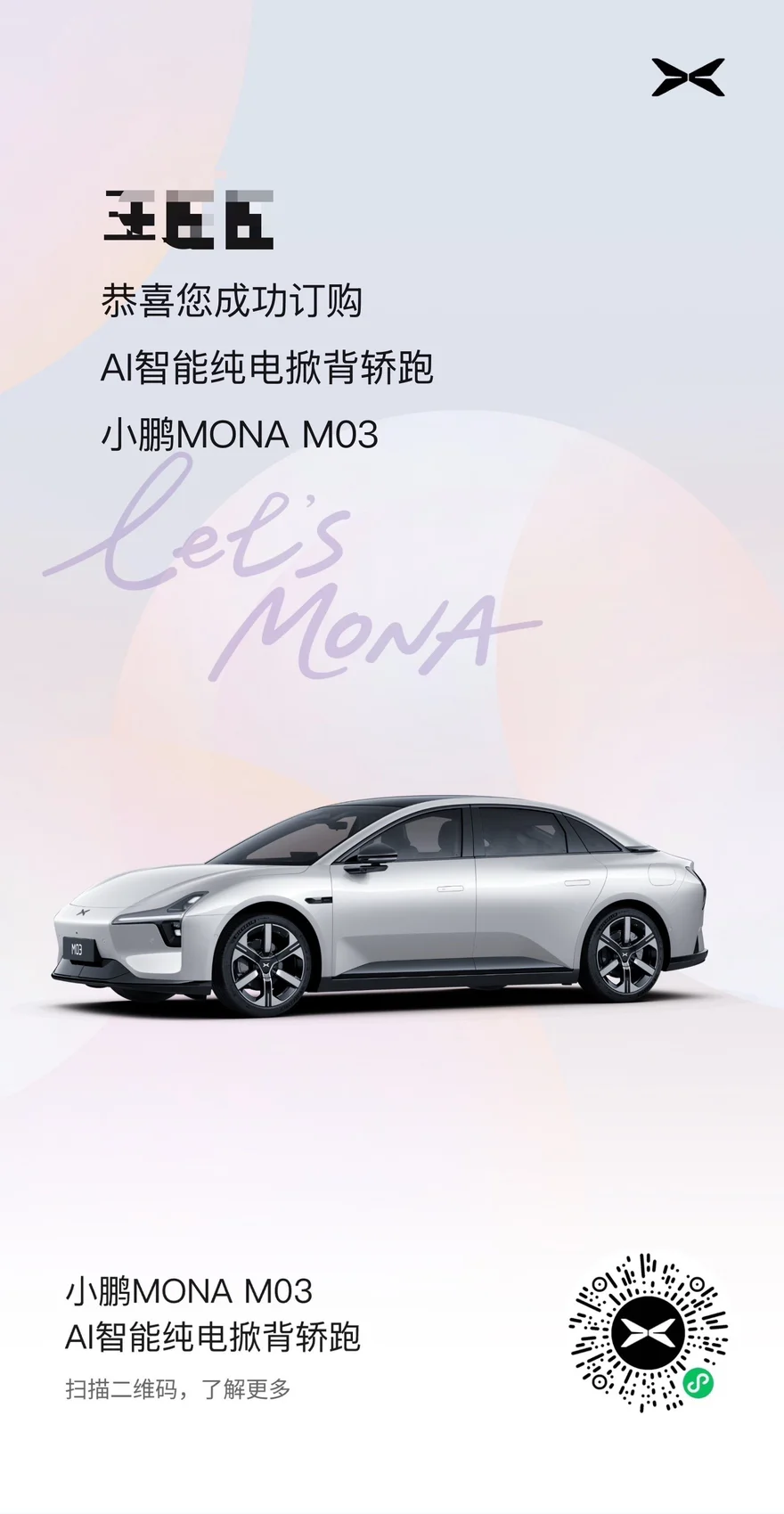 24岁今年大学应届毕业,不靠家里,全款拿下小鹏MONA M03 610超长续航Max顶配!从关注小鹏品牌到试驾MONA,一眼就被这台AI智能纯电掀背轿跑戳中了心巴。