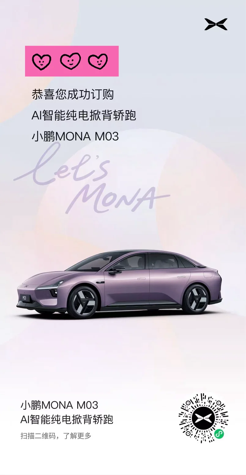 对比了特斯拉Model 3,最终还是选择了小鹏MONA M03。Model 3的品牌力和续航表现不错,但M03在颜值设计上更符合我的审美,紫色配色是Model 3完全没有的亮点;同时M03的智能化配置、座舱体验更贴合国内用户的使用习惯,性价比也更高,综合下来M03才是我的最优解。