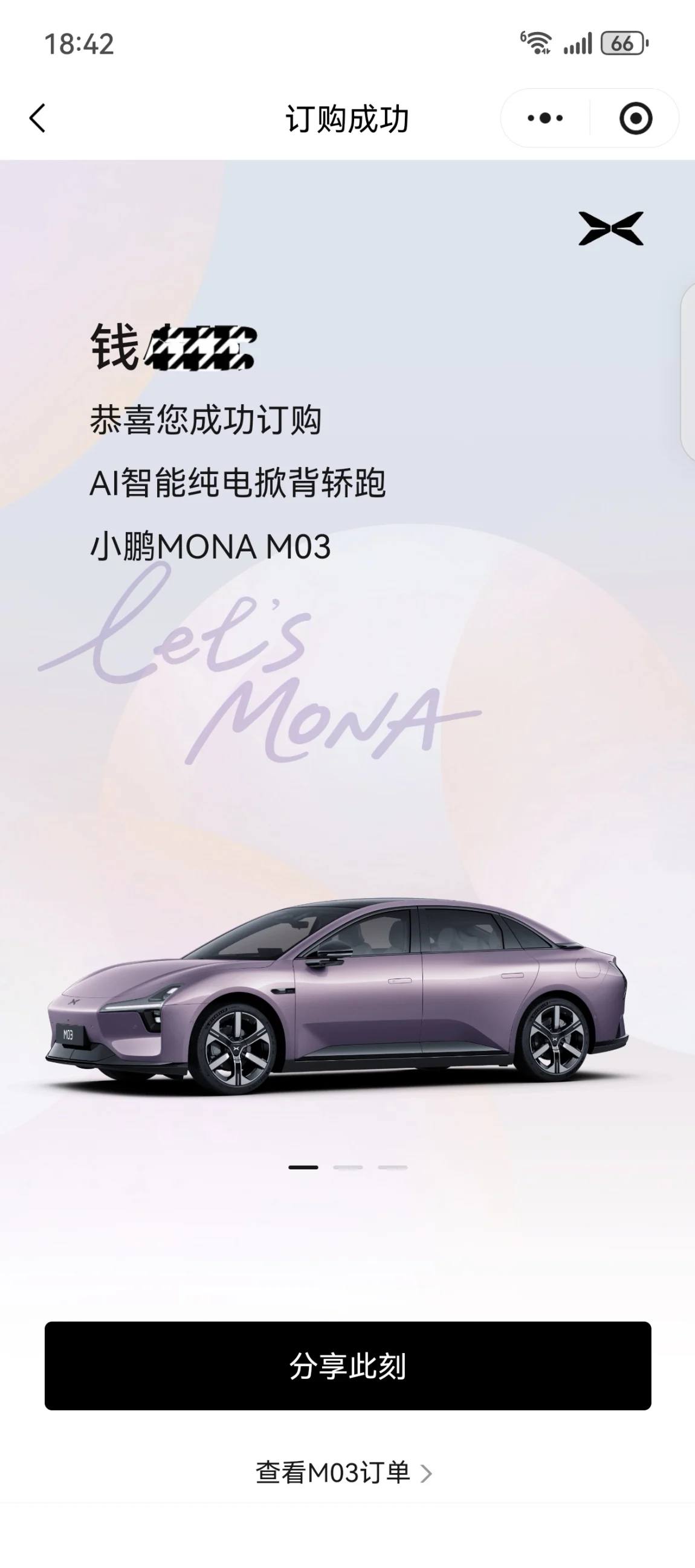 #小鹏MONA M03# 第二辆车小鹏MONA M03【颜色配置】我们选的是510MAX紫内紫外加19寸轮毂【下单理由】从去年25款就关注M03了,由于老婆刚拿驾照,开车不熟练,所以拿家里旧车练手;看见26款小鹏M03出来果断下定,26全款相比25款升级了太多,还有什么理由不买呢?【对比车型】我们也看了其它车型海豹06、深蓝l06,相比之下老婆还是最喜欢M03的外观,青春活力,颜控看了根本走不动路。【需求场景】这辆M03买来主要是老婆上班开;上班主要以高速为主,M03优秀驾驶质感和行业领先的辅助驾驶,让我们更加坚定的选择小鹏M03