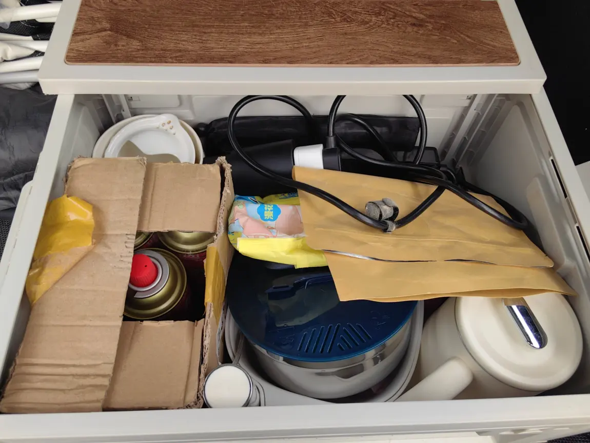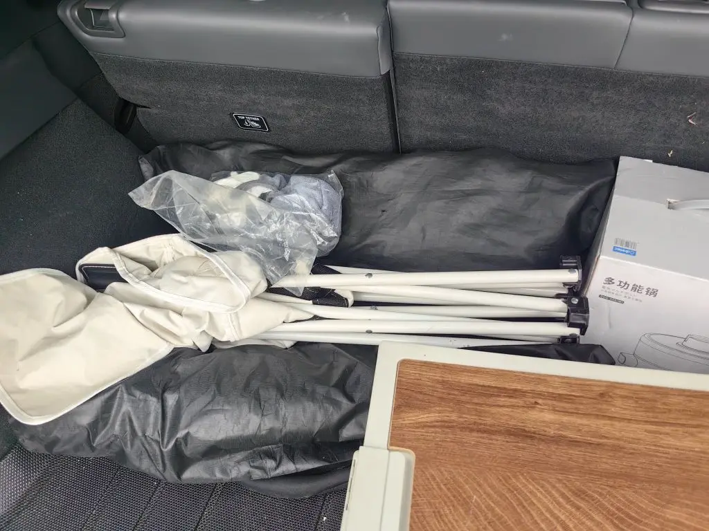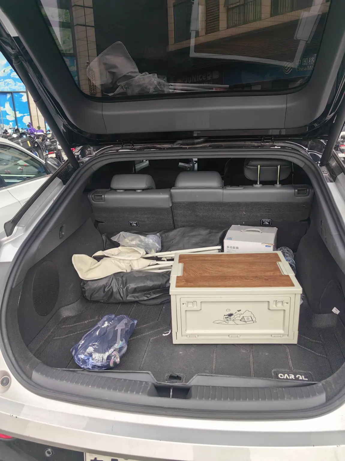 #我的移动储物间# 小p就像一个行走的家。日常我把所有的露营装备都放进后备箱。桌子×1,月亮凳×2,天幕×1。雨伞×1,收纳箱×1。里面会有锅碗调盆,炉头,茶叶,茶杯。煲水壶,照明灯。放电枪,排插。湿巾。洗洁精。还有后备箱下沉空间会有小桌板,遮阳板,水袋。露营垫。总之,现在随时随地,都能自给自足。哈哈哈哈。后备箱如此巨大,但是完全影响不到后排座椅舒适性。甚至接上猪队友,还可以放2个行李箱的空间!真棒!