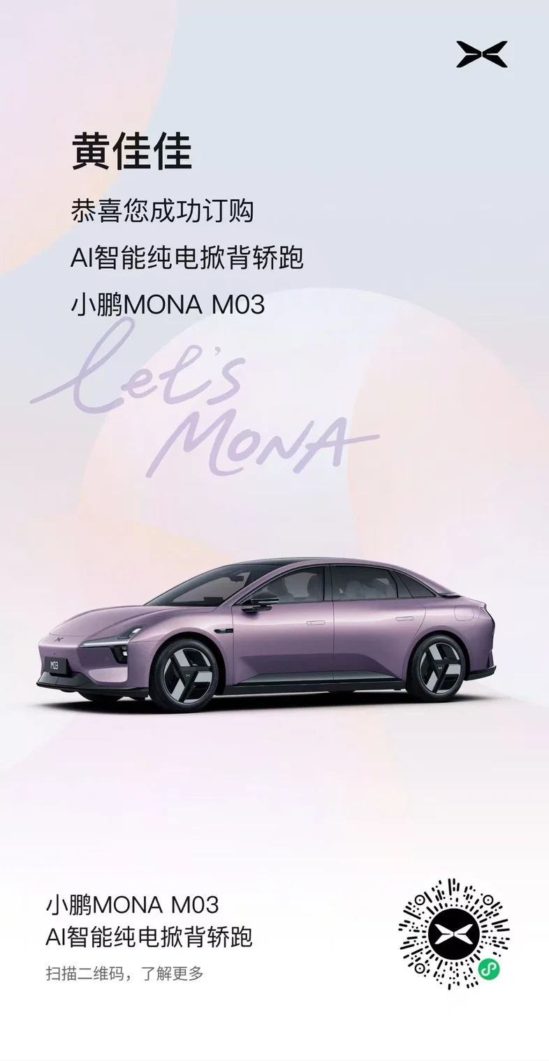 【颜色配置】选了小紫!紫外紫内!奶fufu的,简约又高级【下单理由】被性价比狠狠拿捏了!自动泊车完全抵消了我的停车焦虑,这个价位能买到这样的配置,真的闭眼冲!【对比车型】对比了同价位比亚迪海鸥,最终还是选了小鹏,智能配置、外观、辅助驾驶上小鹏都更符合我的需求!【需求场景】日常20公里上下班通勤,偶尔周末带家人周边游开始期待提车的日子🥳#小鹏MONA M03#