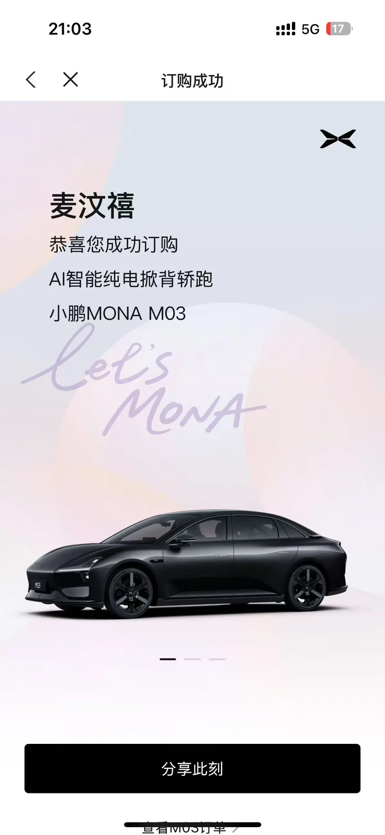 #小鹏MONA M03# 4月2号看完发布会迅速锁单订车,再到7号提车,等待了5天终于提到自己的Dream car了,其实让我选择小鹏的理由很简单,无论是从外观 内饰 驾驶质感在同级别都是独一档的存在,相比起大众id3和深蓝lo6,小鹏的智能座舱和外观都是领先其他品牌的,印证了何小鹏说的一句话,这就是年轻人的第一台车。