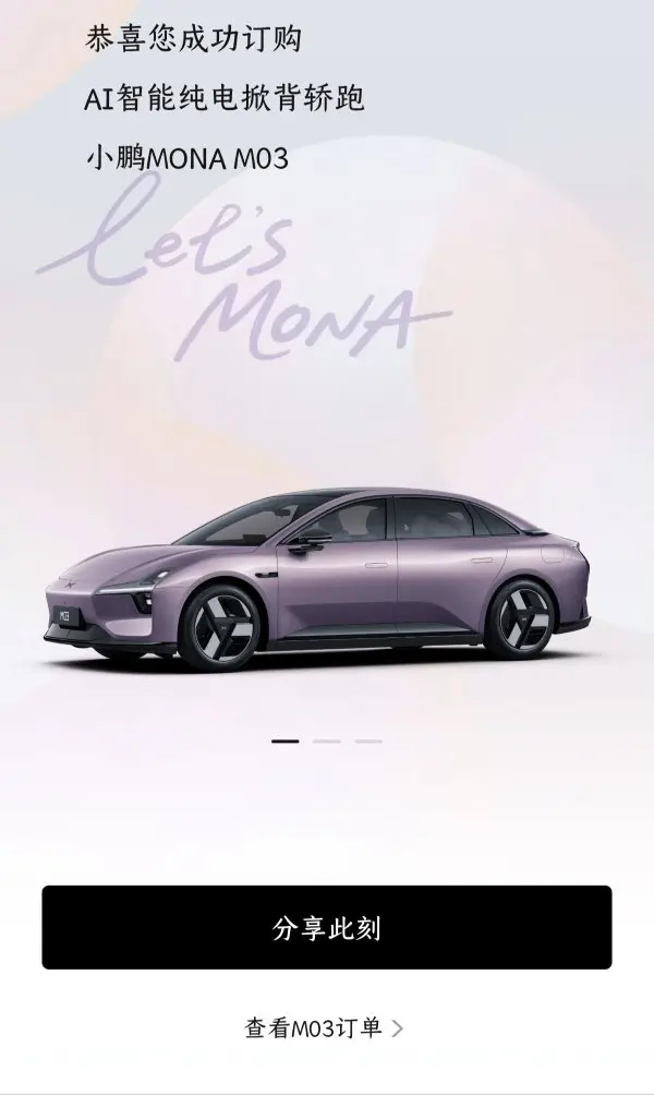 #小鹏MONA M03#【颜色配置】喜欢紫色,🤔加上又是九紫离火运的十年,不选紫色还要选啥哈哈哈。所以选了紫内紫外,加上第一辆车应该就是城市代步,不会频繁跑长途啥的,所以就选了510max。(买小鹏不买智驾版本相当于没买!)【下单理由】同价位智驾夯中夯,加上我不太会停车倒车,果断选择了小鹏。【对比车型】对比了同等10+价位的,用料好的智驾不够,智驾还行的价格又超了。哦对对还有一点,座舱体验真的还不错(后排除外)。【需求场景】城市代步~通勤。