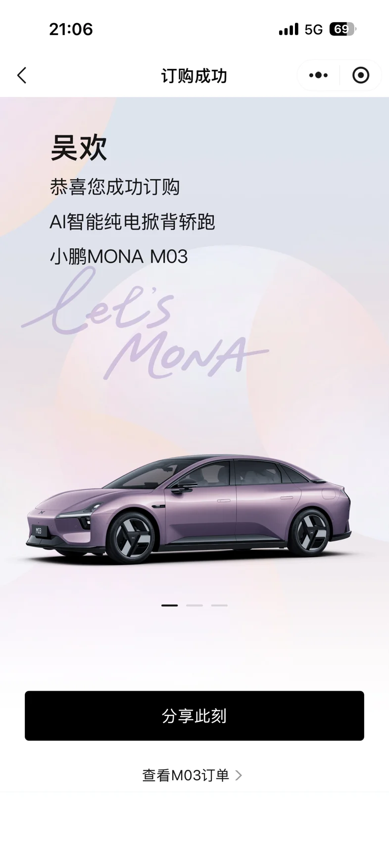 关注MONA M03这款车好久了,上周试驾后就毫不犹豫下定锁单了,智驾真的15万内最优选!而且外观又特别好看,很喜欢,从锁单后就一直期待配车提车了!大家都什么时候提到车的呀👀