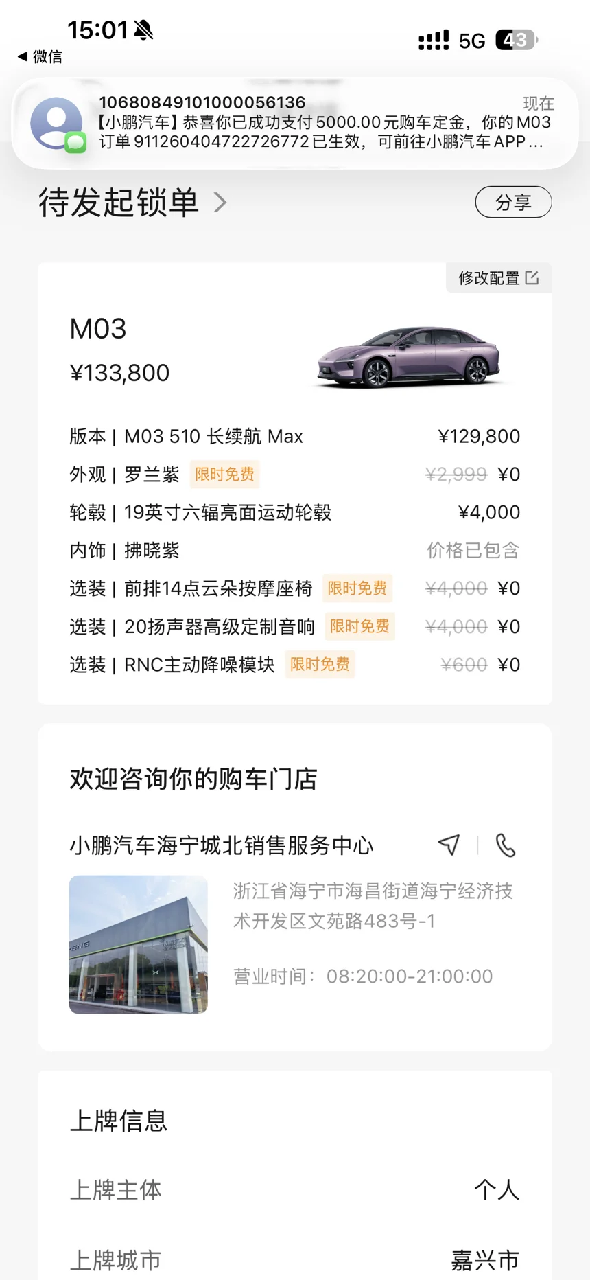 [颜色配置]罗兰紫|拂晓紫内饰|19寸运动轮毂[下单理由]一眼被M03的轿跑造型戳中,510长续航Max版的配置和续航完全满足日常通勤。[对比车型]对比了同价位的几款纯电轿车,最终被小鹏的智驾和设计感圈粉[需求场景]上下班代步+周末自驾,城市通勤选的罗兰紫配色真的越看越耐看,实车的质感比图片还惊艳!试驾的时候被它的操控和智能座舱狠狠圈粉,日常通勤和周末出游的需求都能完美满足,同价位里真的找不到比它更戳我的纯电轿跑了!已经开始期待提车啦~