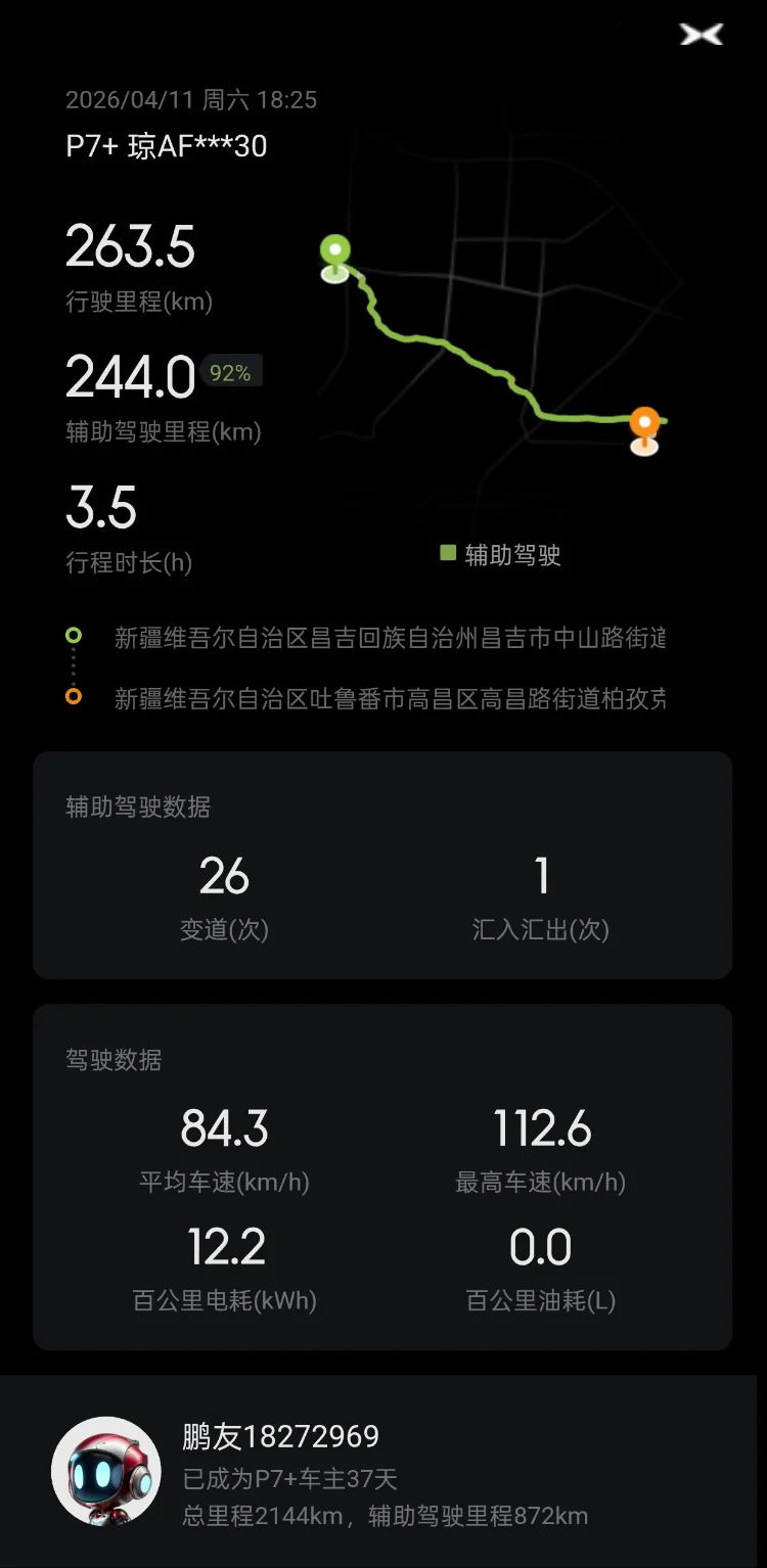 周末出游吐鲁番,单程263.5公里,辅助驾驶244公里,辅助里程92%,百公里电耗12.3比手动能耗还低😁