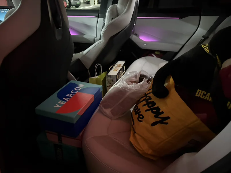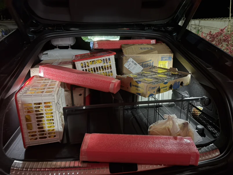 因为小鹏P7溜背式设计真的很考验后备箱塞东西的技术,当时过年塞满一整个后备箱,就是需要思考,所以这次能塞进去很惊喜~带回老家放零食嘿嘿~