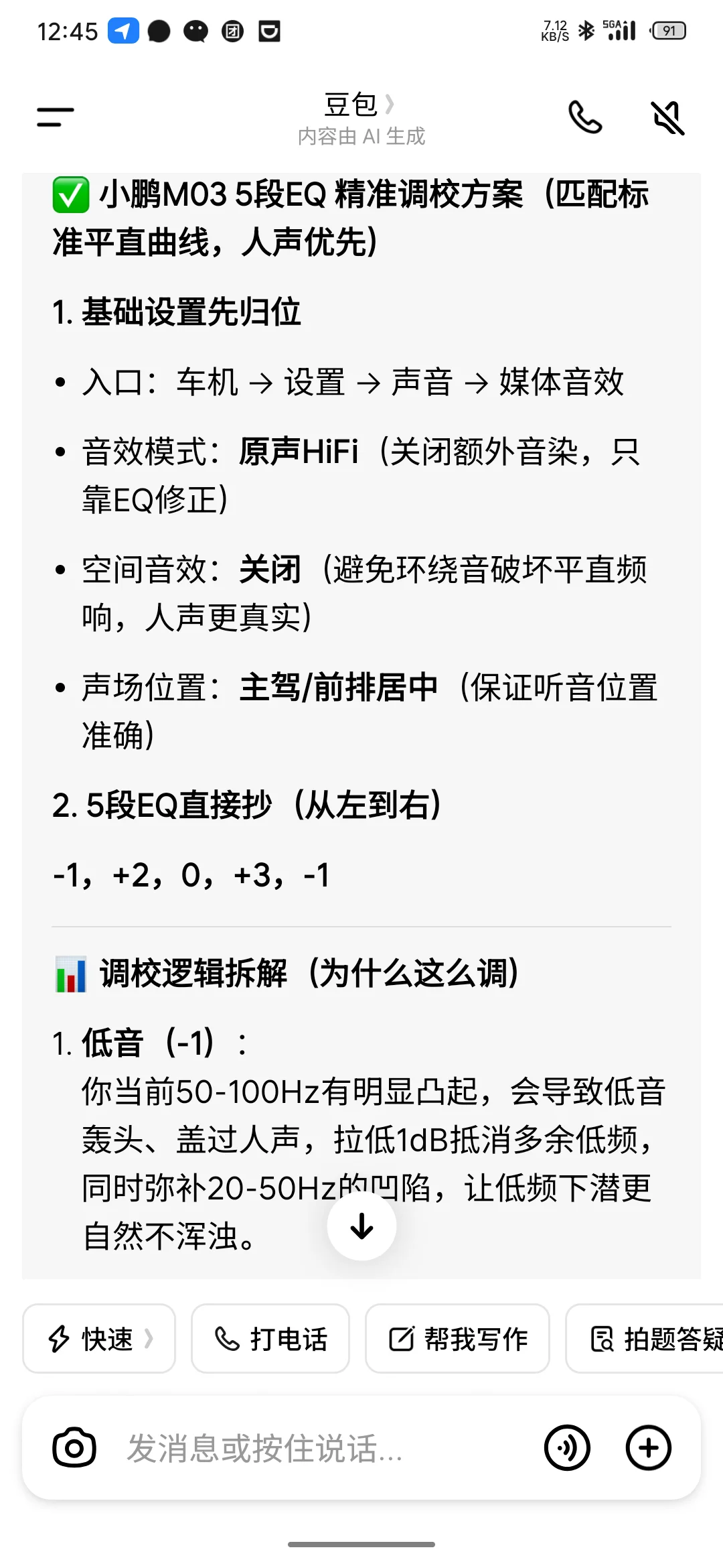 小鹏M03音响终极调校|用「声学觉醒」把原车音响拉满,附保姆级参数哈喽各位鹏友!作为一名小鹏M03车主,车载音响绝对是我日常通勤、长途自驾的「续命神器」。之前总觉得原车音响差点意思:低音轰头、人声发闷、高音刺耳,听久了耳朵累。直到用了「声学觉醒」AI检测校准,终于把这套音响的潜力彻底挖出来了!今天把完整调校方案分享给大家,新手直接抄作业。好不好听你们说的算。我觉得比原本的耐听不轰头了,#小鹏音乐会#