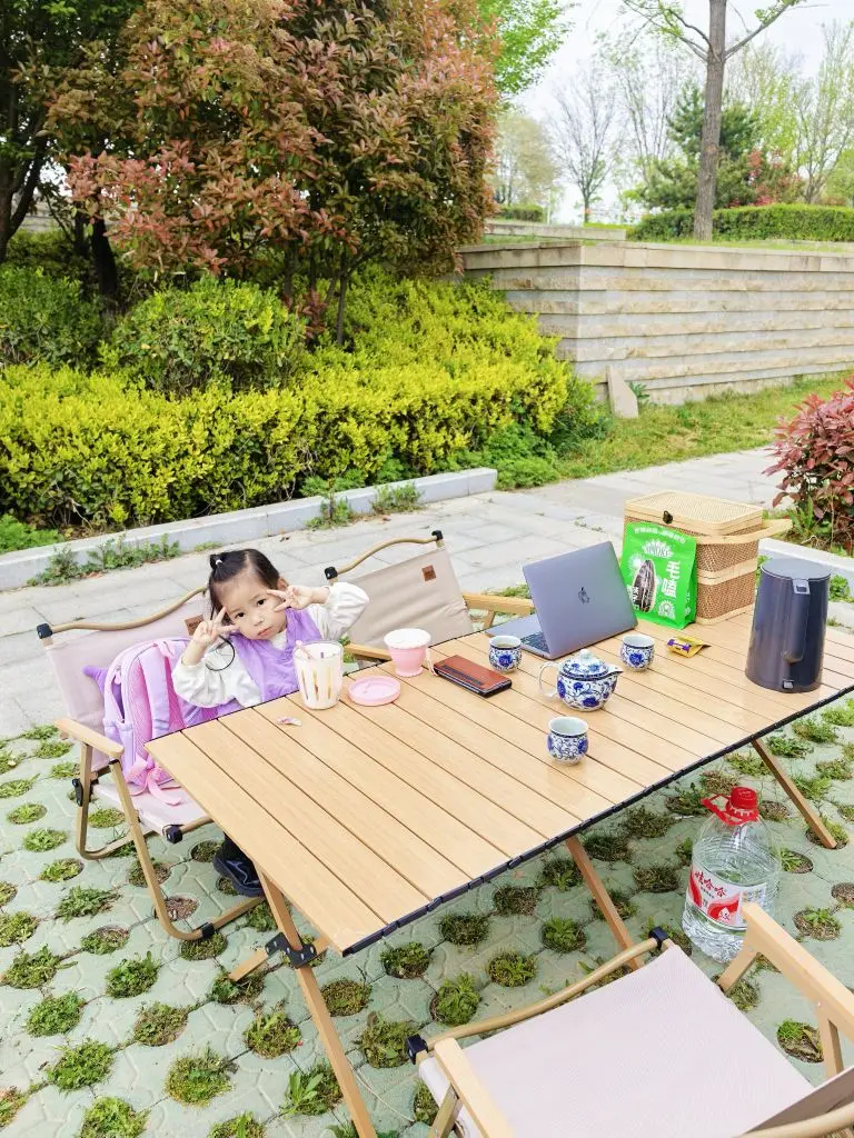 支起餐桌餐椅,阳光透过树叶洒下斑驳的光影。耳边是清脆的鸟鸣,风轻轻吹过,带来青草和泥土的气息。