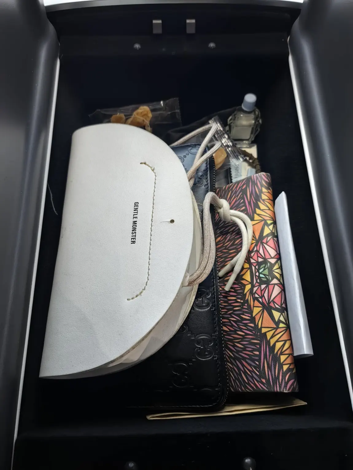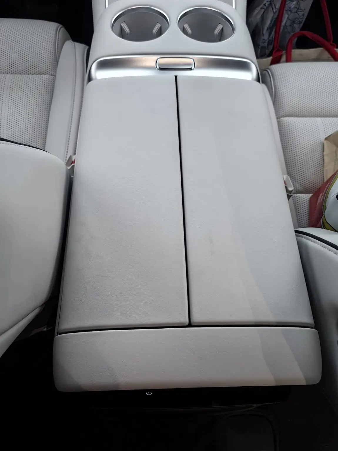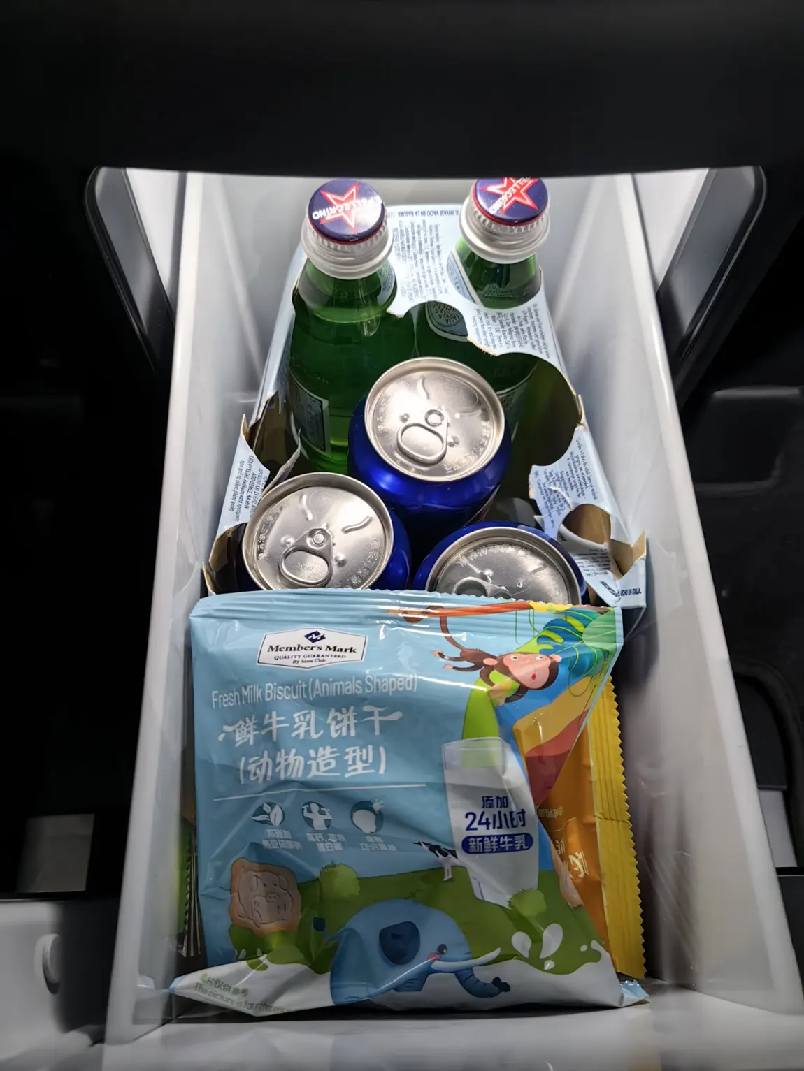 中控扶手箱放了墨镜,开长途的清凉油,还有一些蜜饯糖果,随手拿方便!小冰箱当然是放了圣培露气泡水,马上夏天了,还有百事可乐!和一些小点心,酸奶什么的!!!真是太棒了!