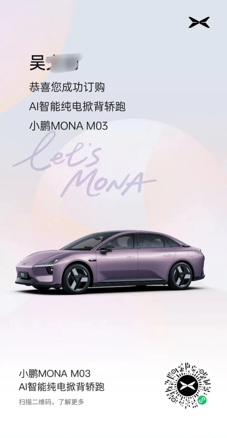 #小鹏MONA M03# 【颜色配置】26款 610ultra se【下单理由】买个车作为结婚周年礼,因为亲自试驾体验过小鹏的VLA2.0,虽然是我在试驾用着XNGP,我老婆说坐后排没觉得是车自己在开,坐得很舒适。果断要上Ultra SE版本,在这个级别里面智能化能做到这个程度觉得很亲民很强啊!【对比车型】对比了大众ID3,BYD 海豹06。还是觉得Mona M03的外观造型配色更适合女孩而且男生也能驾驭。【需求场景】平日90%的城区通勤+10的节假日长途回家需求。610这个配置真的很能理解用户需求。