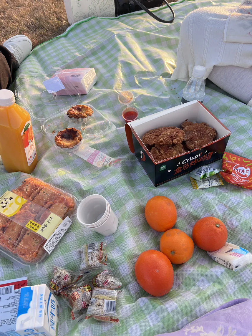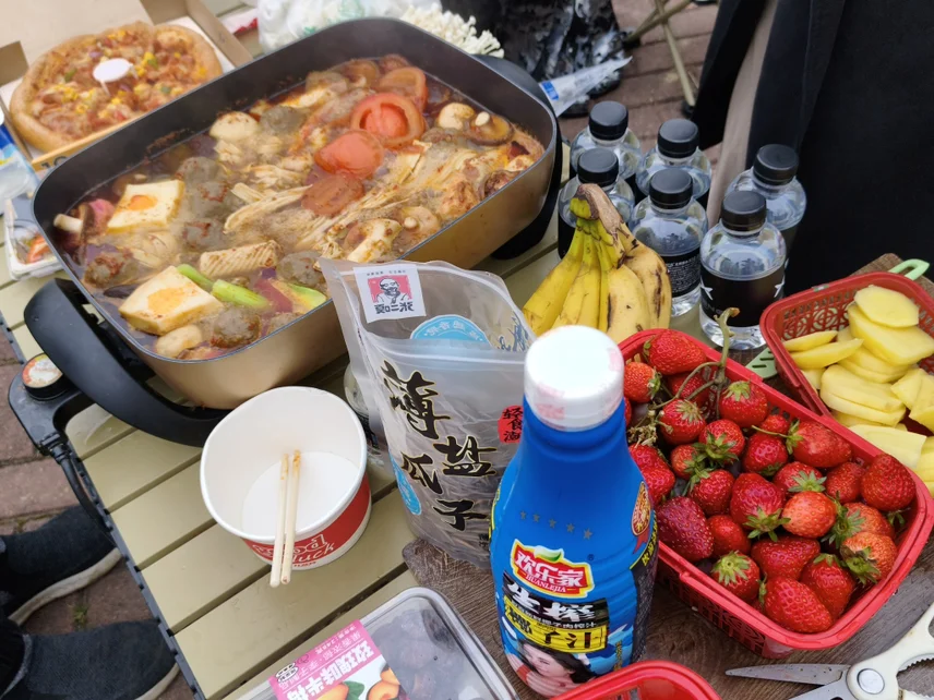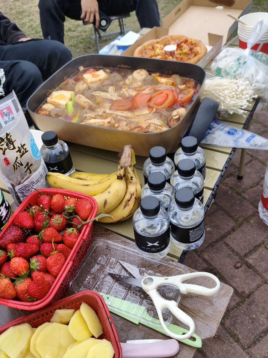 到了目的地就是铺上露营垫,拿出我们的点心零食,摆放好桌板椅子,拿出锅接上电烧水,摆放好精心准备的人食材,大家就热热闹闹的聊上了,一边分享生活的趣事,吃吃最近的瓜,吹着凉风,看着对面人来人往,耳边是朋友的笑声还有远处小朋友的嬉闹声,工作的烦恼在此刻显得一点都不重要,我向后倾倒,靠在了她的肩上,一起享受惬意的时光。🤗