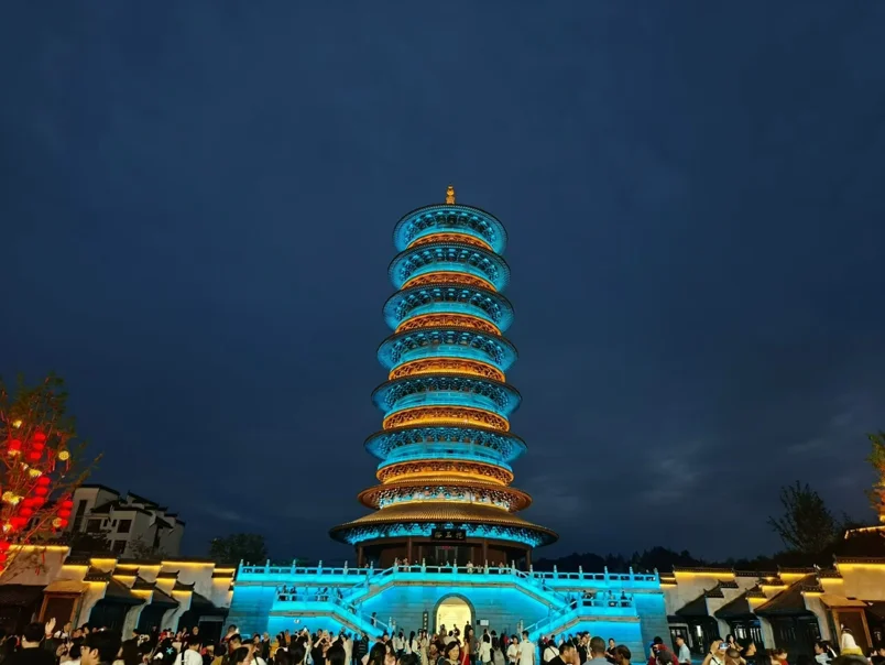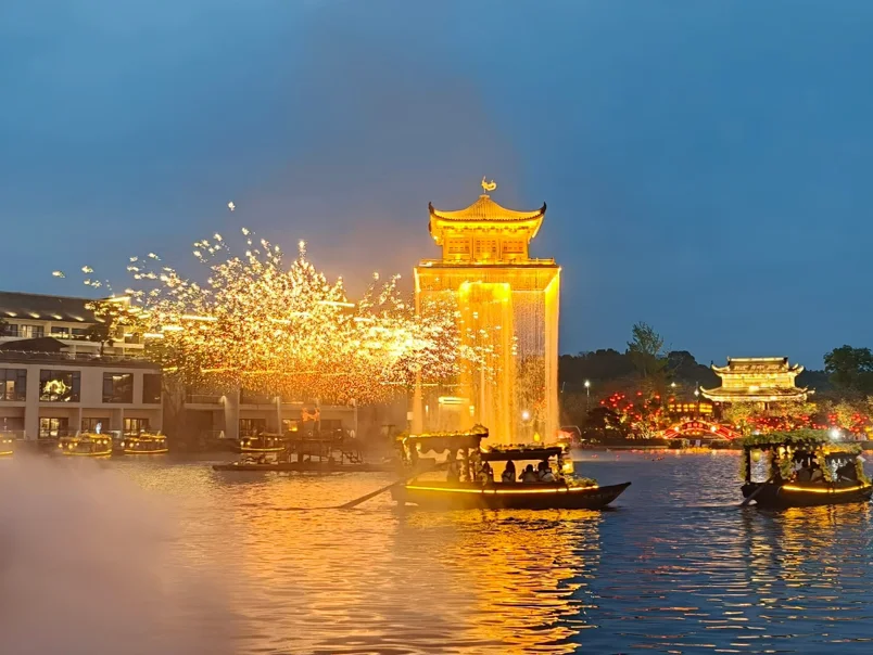 傍晚转场婺女洲,才知道什么叫“一秒穿越”!文墨塔被蓝金灯光点亮,湖面的打铁花炸开的瞬间,金色火花像流星坠入水里,直接看呆了!夜晚的灯笼街挂满鱼灯和彩灯笼,晚风一吹,光影晃得人分不清现实和梦境。