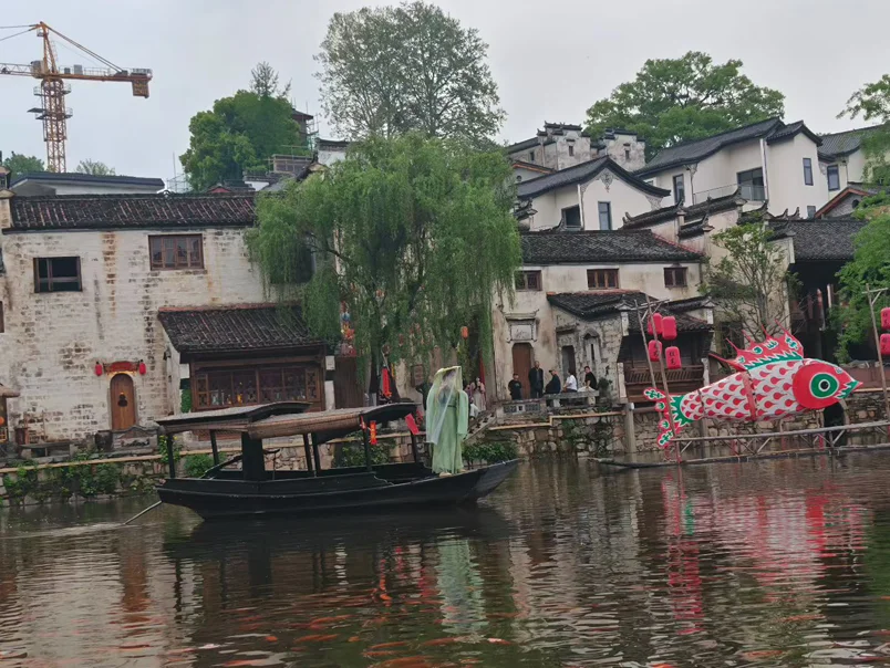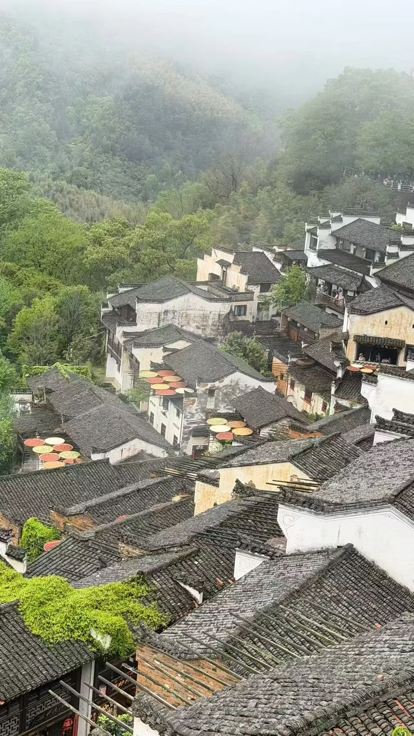 早上直奔篁岭,刚下车就被徽派古村戳中!白墙黛瓦在晨雾里像水墨画,屋顶上晒秋的竹匾红的辣椒、黄的稻谷撞得超治愈,连空气里都是烟火气。走在水街上,乌篷船慢悠悠划过,岸边的鱼灯和红灯笼氛围感直接拉满,还有山涧瀑布清清凉凉,随手拍都是古风大片📸