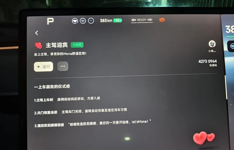 每天开着小鹏去上班,连出发都变得特别有仪式感。一靠近车辆,车门自动解锁,上车时座椅会贴心后移,留出宽敞的空间。关上车门的瞬间,座椅又精准回到我熟悉的舒适位置,伴着欧阳娜娜温柔的语音问候,一天的好心情就这样被稳稳开启。简单的细节,却把日常通勤变成了专属的小美好,每次出发都充满期待。