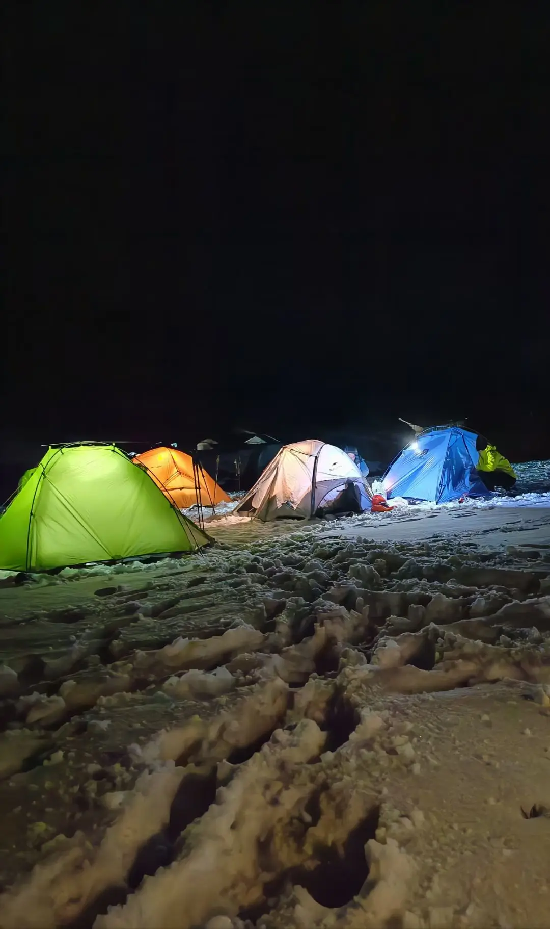 登顶之后,放眼望去全是皑皑白雪,视野特别开阔。于是我们便开始安营扎寨,直到夜幕降临,帐篷内灯火亮起,好友围坐在一起,分享着自带的美食,谈天说地,畅聊心事!