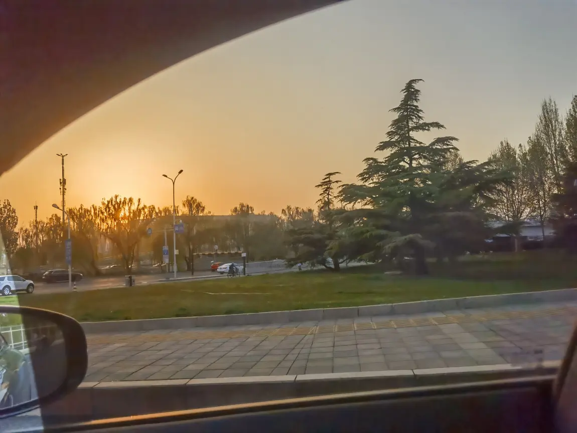 橘色的夕阳把整个西天染透了,光穿过树梢碎成一片片金箔,落在方向盘上。