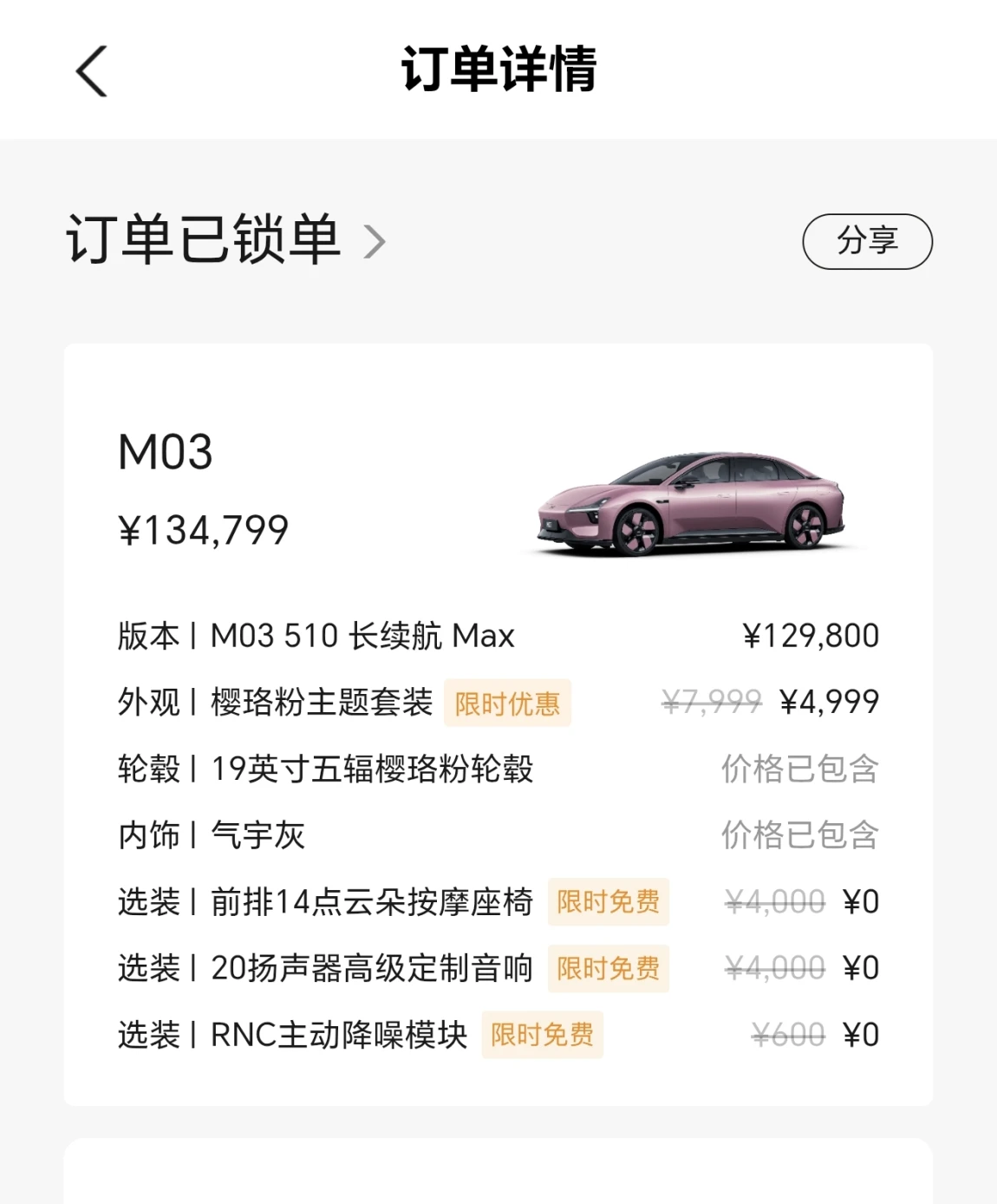 目标确定了510max这个版本,剩下就是确定颜色了,因为现场只有罗兰紫,据说定这款颜色的太多,真怕以后满大街都是这个罗兰紫(虽然很喜欢这个颜色),后续就是到其他店看看牛油果绿和樱珞粉,果断选择了樱珞粉,机油是原价7999元的套餐,现在只要4999元,且升级19寸轮毂,全真皮座椅,本来买其他款也要更换19寸轮毂的(选装费4000元),相当于多出1000元而已。而且樱珞粉确实出彩,相信目前定的人不太多,这样厂家配车也会快点。