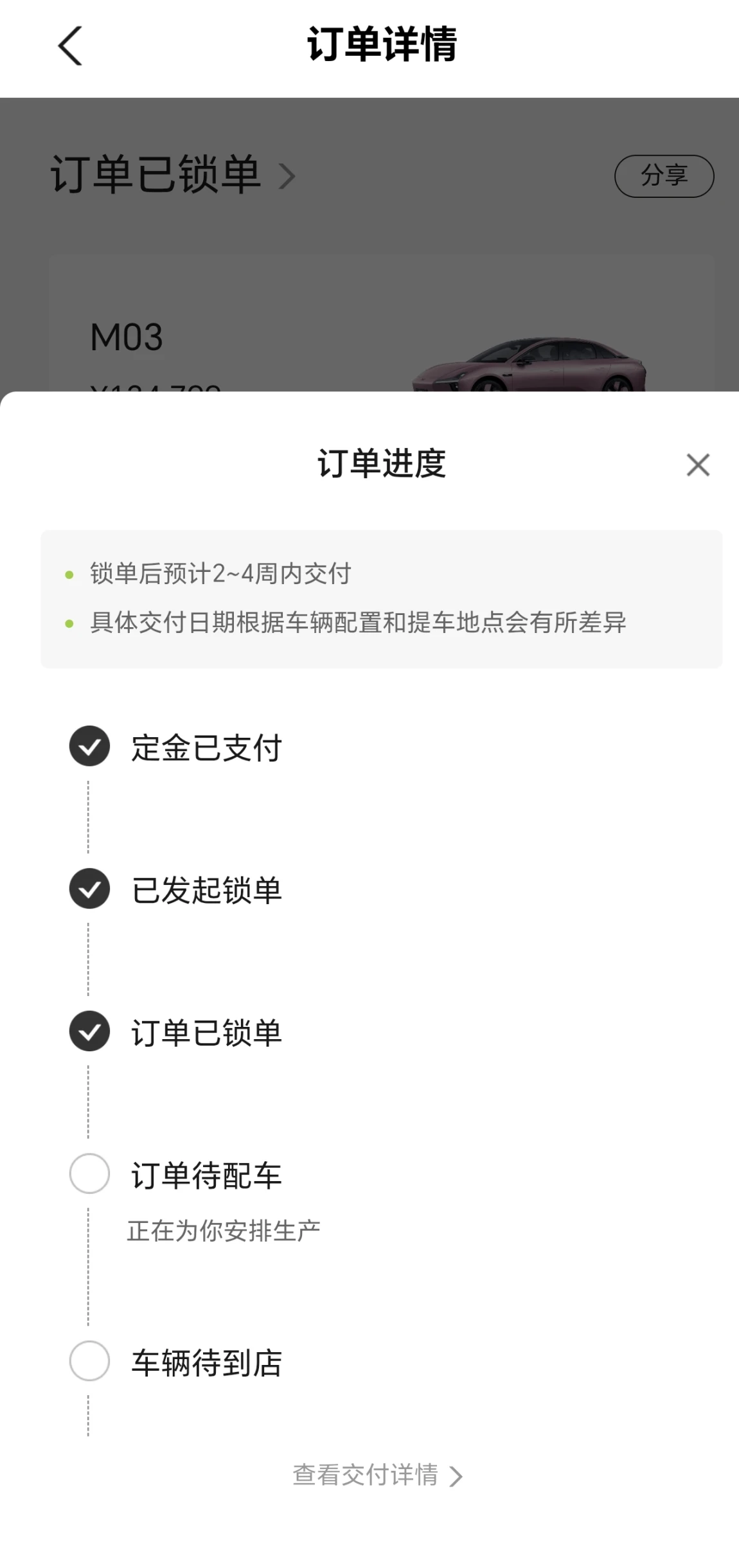 于是和销售沟通了二手车置换及相关的下定流程后,在4月10日中午线上商城下单并锁单,目前每天就来看看有没有配车,我估计所有下单的人都和我一样的心情,天天看流程有没有变化😊