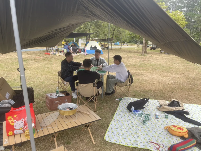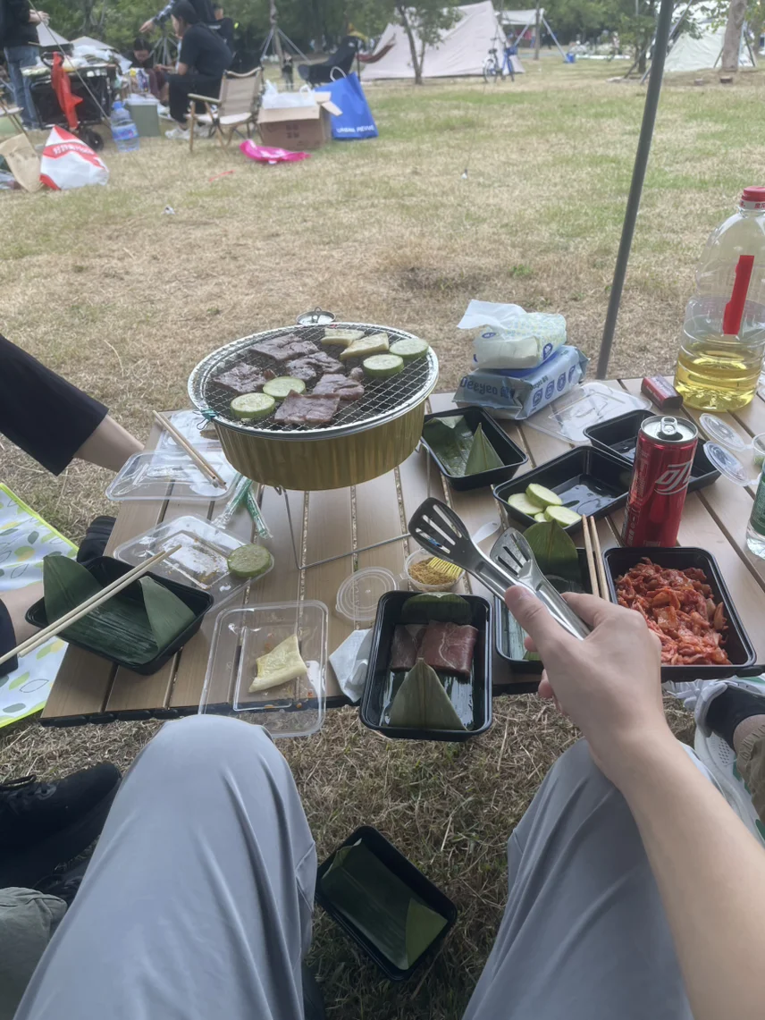 烧烤食材可以提前在家腌制好带过来,周边也有便利店补给,甚至可以点外卖送到露营的地方,小哥太强了!烤架上滋滋冒油的肉串+冰可乐,再配上朋友间的麻将局,快乐直接拉满!打累了就躺野餐垫上晒太阳,看湖边风景,主打一个彻底放松😴