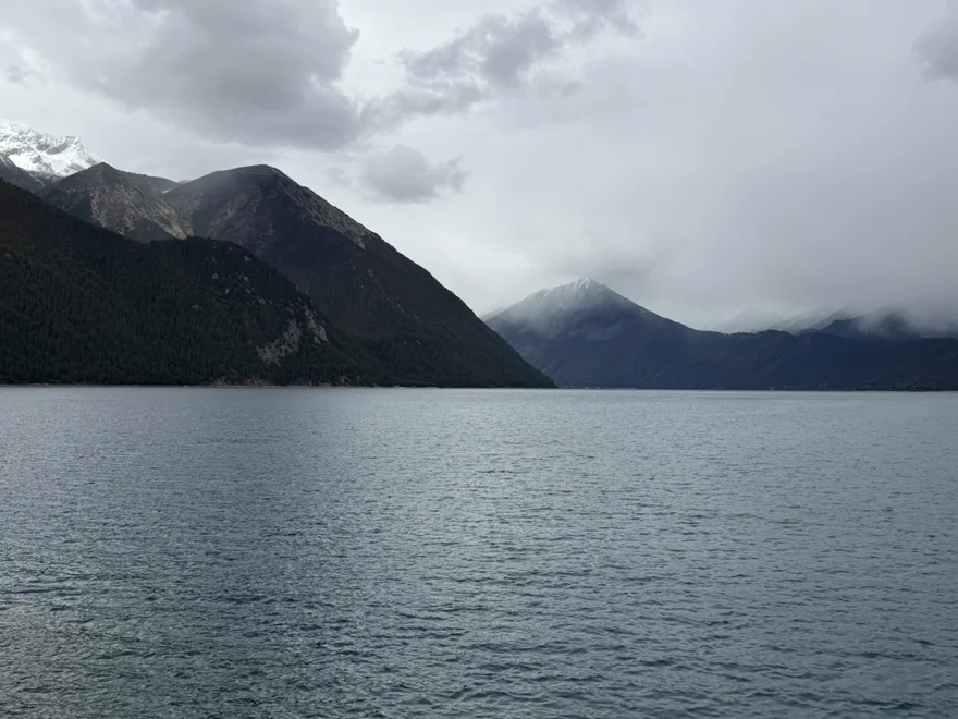 当日最后一站巴松措,简直是是藏地送给我的礼物。湖面笼着一层薄雾,像蒙着轻纱的镜子,远处的雪山尖顶在晨光里慢慢亮起,把倒影揉进了湖水里。