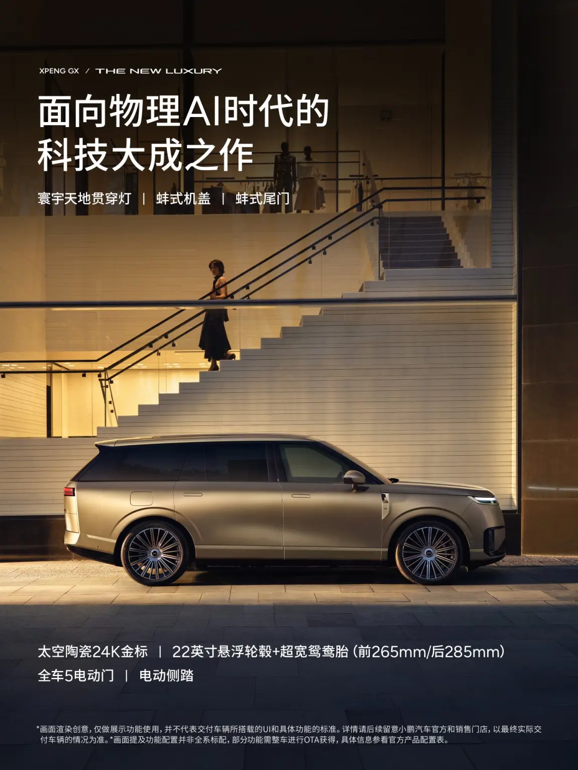 作为小鹏全尺寸旗舰SUV,GX以5265mm车长、3115mm轴距的游艇式流线车身,自带大湾区揽胜级别的大气格局。全系标配线控转向与后轮主动转向,大车身也能从容好开,全场景智驾算力拉满,旗舰气场与实用兼具