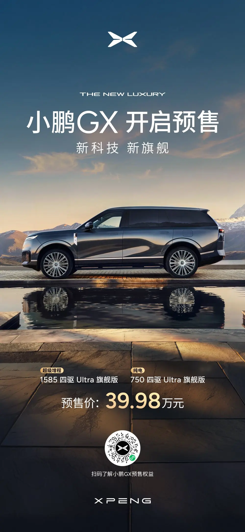 小鹏GX定位旗舰豪华纯电/增程SUV,预售价39.98万元起,主打极致智控与头等舱舒适。