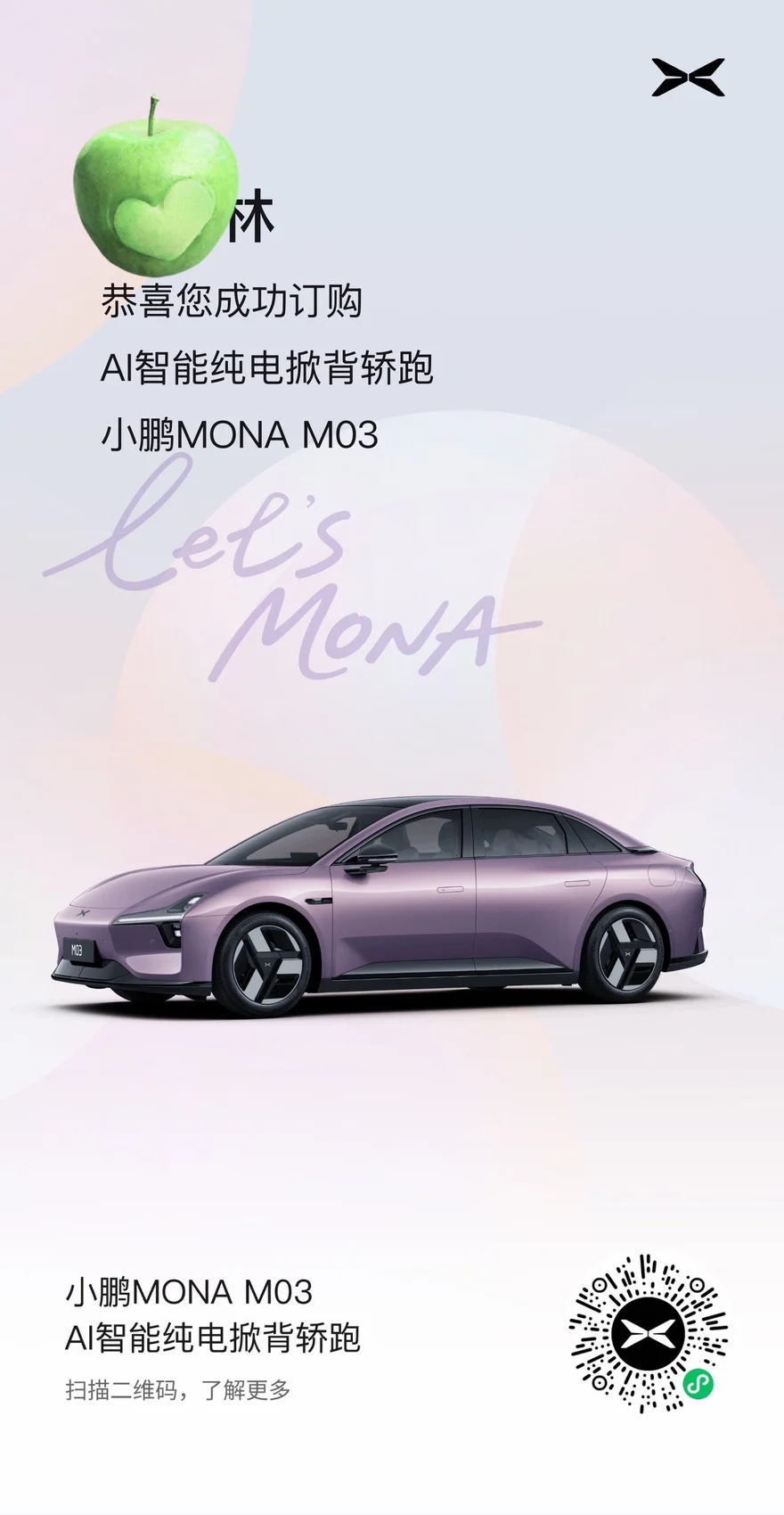 纠结了好久,把原来的车卖了,做了置换,终于下定心心念念的小鹏M03啦,一开始看了25款,就很喜欢,听说26款要出来了,于是就等等看,结果26款更是完美,一开始纠结颜色,新出的牛油果绿特别清新适合夏天,后面觉得紫色更耐看更高级又改了颜色,罗兰紫很戳我,简直就是美女车来的,低调又高级,阳光下带细闪超好看,简直太适合女孩子了,外观内饰,智能空间,每一点都踩在我的需求上,太赞了,而且男女都合适,智驾,自动泊车,方向盘加热,座椅加热,无边框后视镜,360全景影像等等,配置拉满,夯爆了,期待早日提车,加入小鹏大家庭! #小鹏汽车# 小鹏MONA#2026款小鹏MONA大大大大大升级