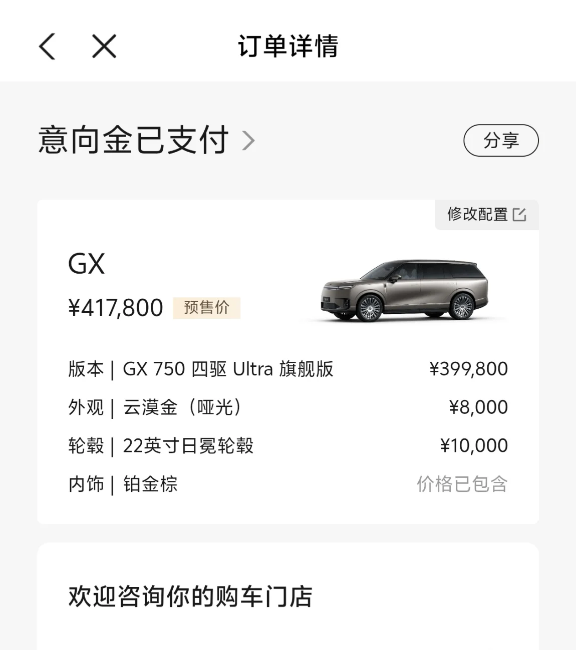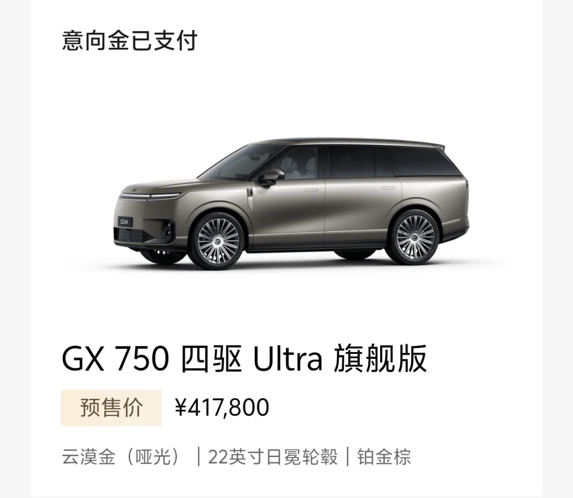#小鹏GX开启预售# 付完1000元意向金,心里满是期待与欢喜。从关注小鹏GX发布会开始就一直心动,反复对比后终于下定决心,静静等着新车到来,这份期待真的藏不住。 最让我动心的是它百万级的旗舰气场,加上超大一体式灯带,外观气场十足。智能驾驶好用又省心,AI隐私玻璃对家庭出行格外友好。我特意选了哑光云漠金这个新车色,哑光质感高级又独特,越看越喜欢,不管是科技豪华还是日常实用都很到位,下订一点不后悔。
