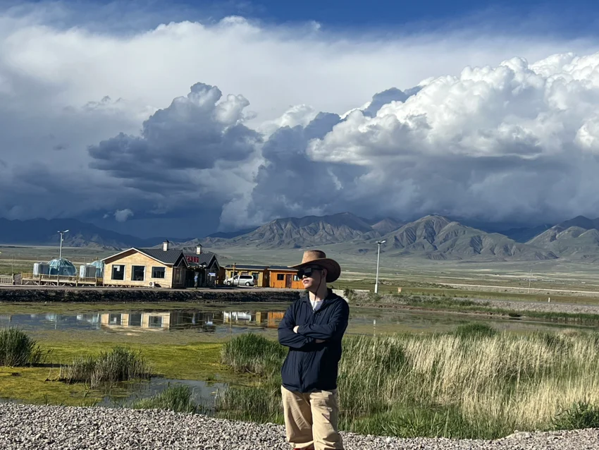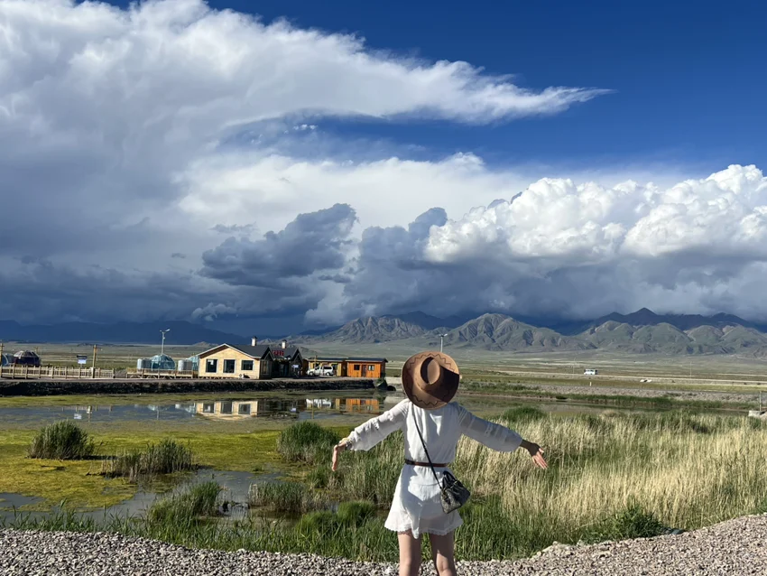 去往茶卡的路上,一半是晴空万里的亮蓝,一半是云层翻涌的灰蓝,远处是连绵的雪山,近处是开阔的草原,光影在天地间肆意流淌,随手定格都是绝美的风景。