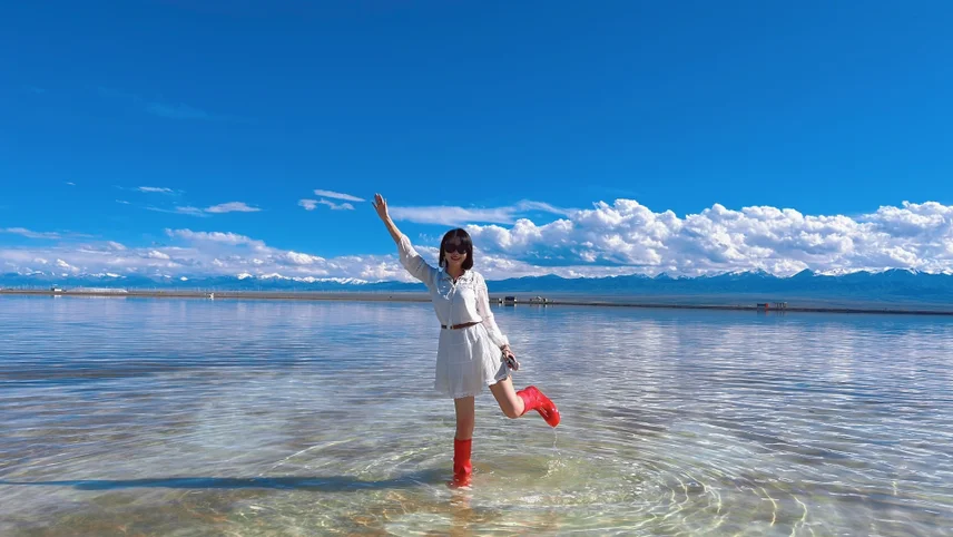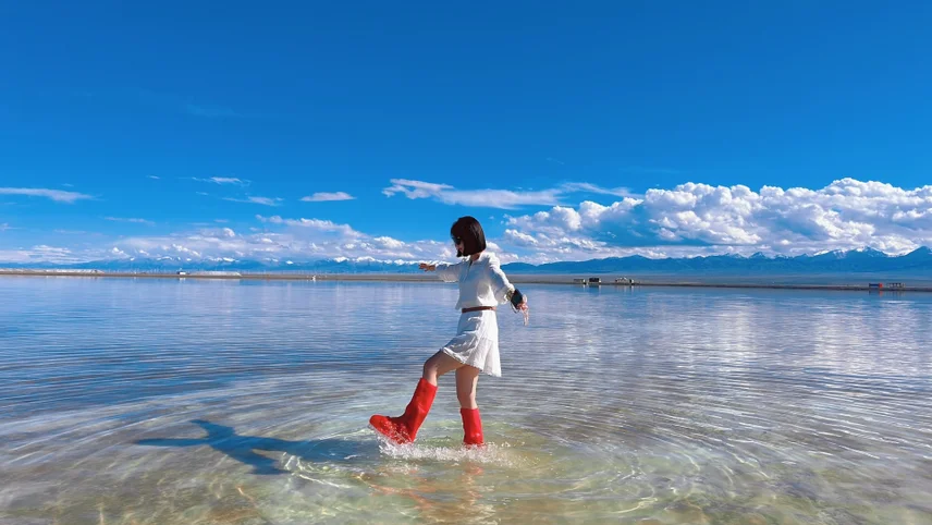 纯白的盐滩与澄澈的蓝天交织,组成最干净的户外色系,踩在盐湖里,仿佛漫步云端,每一帧都是治愈感拉满的大片。