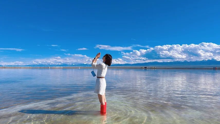 脚下是洁白的盐晶,湖面如镜,将蓝天、白云、远山完整复刻,水天一线,天地同色。