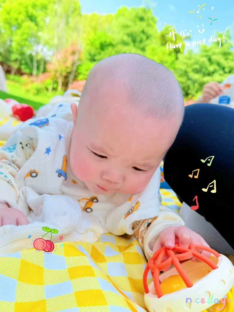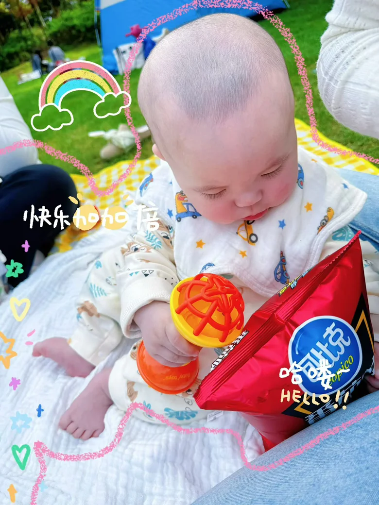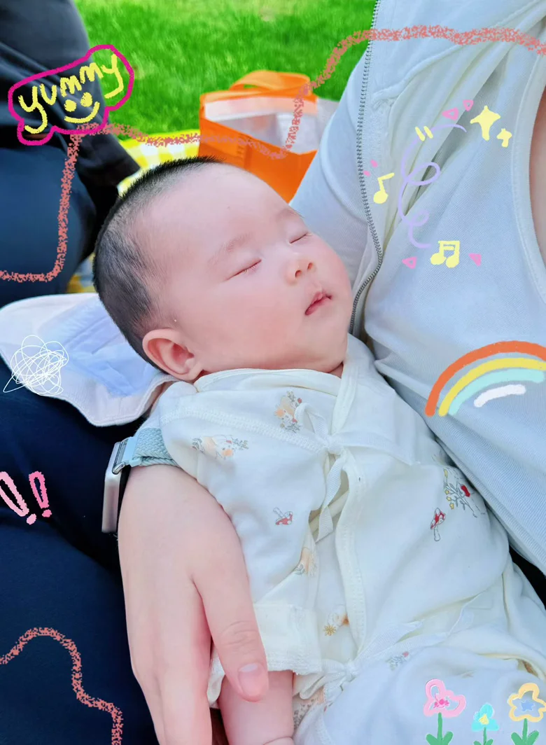 到了草坪上,铺好餐布,摆满薯片、果冻、卤味和新鲜菠萝,就是属于我们的快乐小天地。一个小宝贝在怀里安安稳稳睡成小天使,另一个趴在垫子上抓着玩具好奇探索,软萌的小模样,把整个夏天的温柔都承包了。