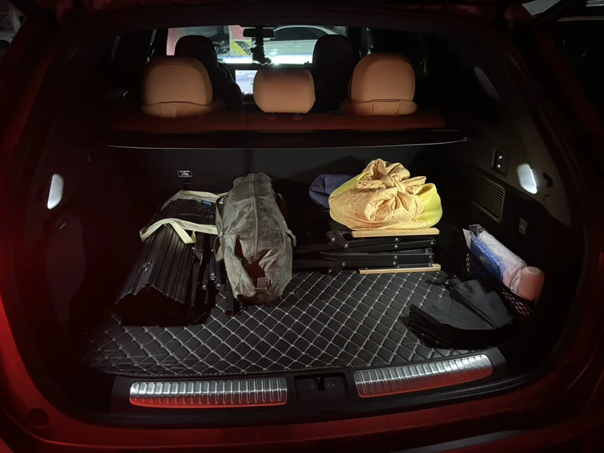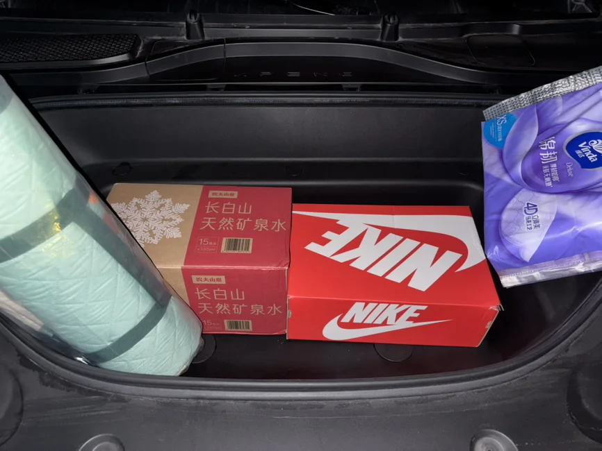1.前备厢位于车头,容积约71L,打开前舱盖即可轻松取用,我拿来装多余的纸巾、野餐垫、运动鞋和矿泉水,能够刚好放下满满当当;