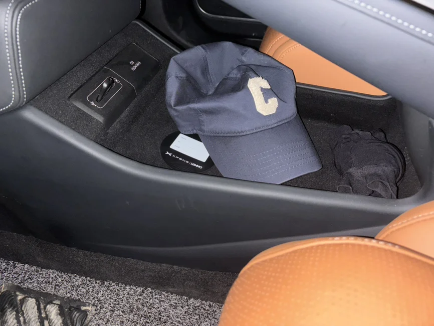 2.前排中控台下方储物槽采用掏空设计,容积较大,可放置挎包、快递等较大体积物品,我放了一顶帽子🧢;