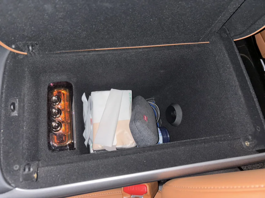 4.中央扶手箱内部空间较为宽敞,可存放钱包、证件、眼镜、纸巾等日常物品。