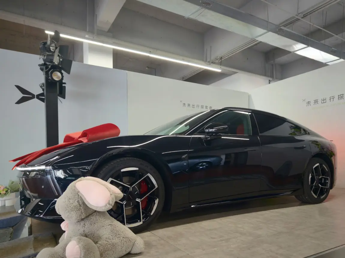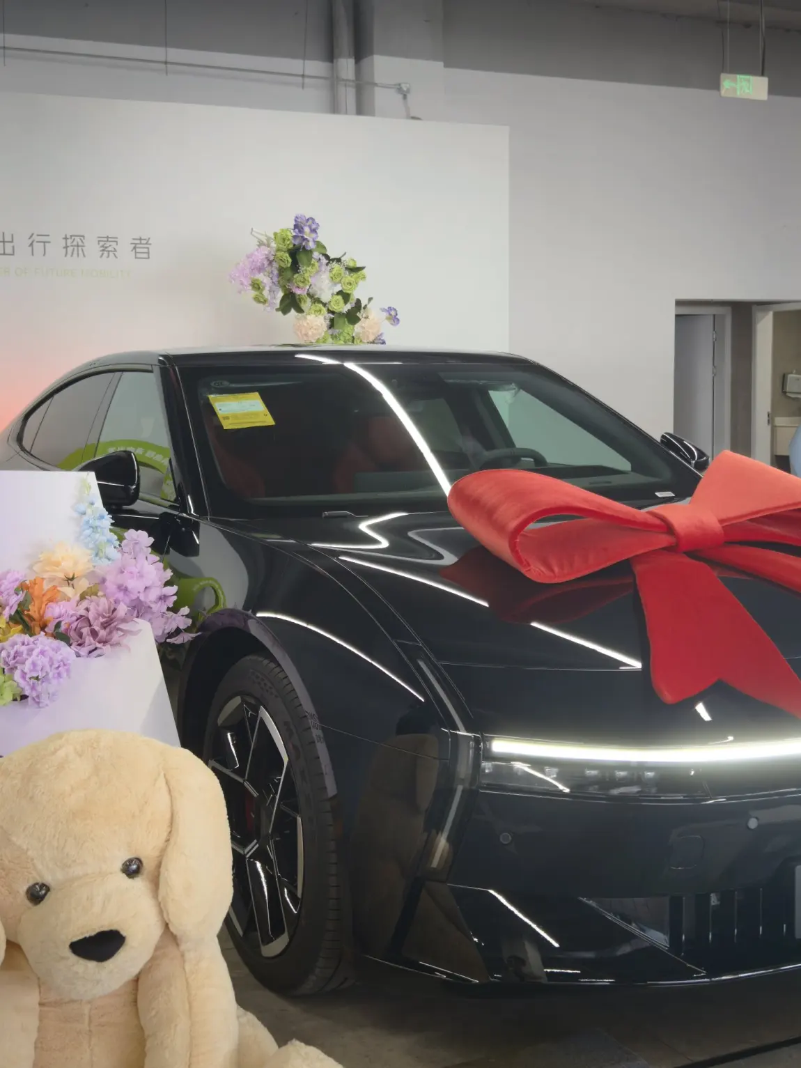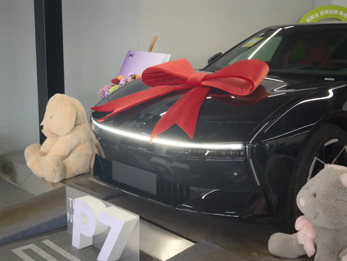 等了半个月!我的黑武士P7终于到了😭 提车那天4S店布置得超用心,大蝴蝶结+玩偶直接戳中我!