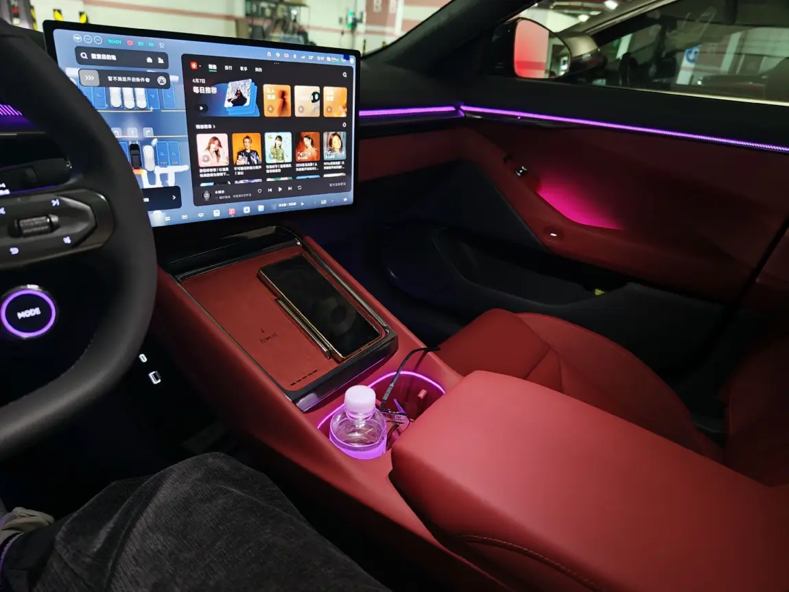 👉内饰红黑撞色绝了!大屏流畅度拉满,语音控制反应超快,开车时说"你好小P"比女朋友还听话哈哈~氛围灯随音乐变色,晚上开车氛围感直接拉满💖