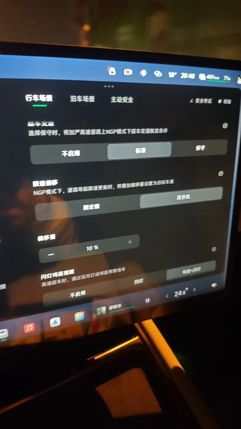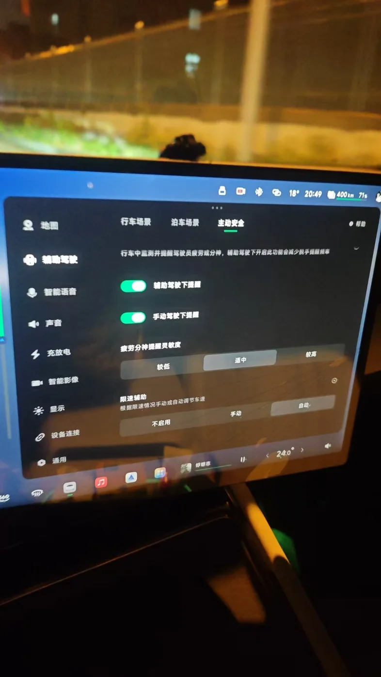 再说说大家最关心的细节设置,我这次把超车变道设为「标准」,限速偏移拉到了10%,闪灯鸣笛提醒也开了,整个过程非常省心。面对快速路的连续变道和无保护左转,它的决策逻辑特别清晰,提前打灯、观察、择机变道,整个过程丝滑流畅,比我自己开都稳。尤其是夜间的识别能力,以前怕的逆光、对向来车,它都能稳稳识别,主动安全里的疲劳提醒也很贴心,不用再担心走神。