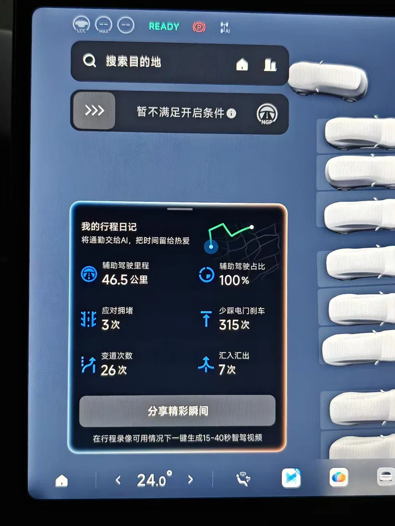 以前上下班,就算开着NGP,我也得时刻紧绷着神经,生怕它跟车顿挫、变道犹豫,哪怕更新了人机共驾,遇到加塞也得随时准备接管。但这次不一样,6.0系统的UI界面清晰直观,辅助驾驶的状态、周边车辆、导航信息一目了然,完全不用我分心去猜它下一步要做什么。面对晚高峰的拥堵路段,跟车距离和加减速控制得刚刚好,不顿挫也不拖沓,旁边车加塞进来时,它的反应又快又稳,提前减速避让,一点不慌。