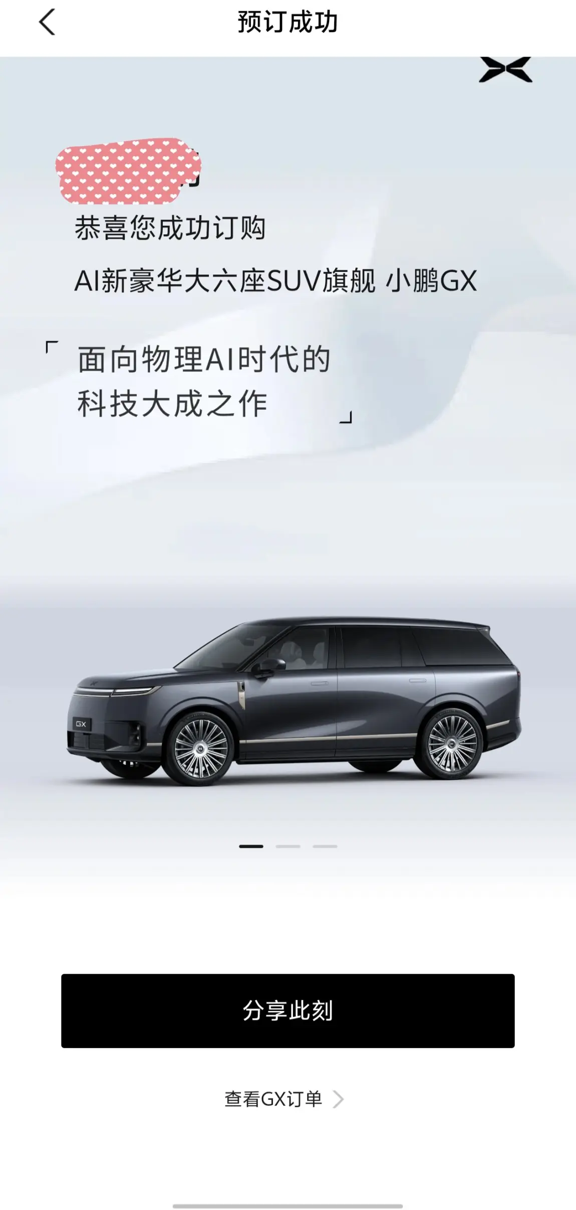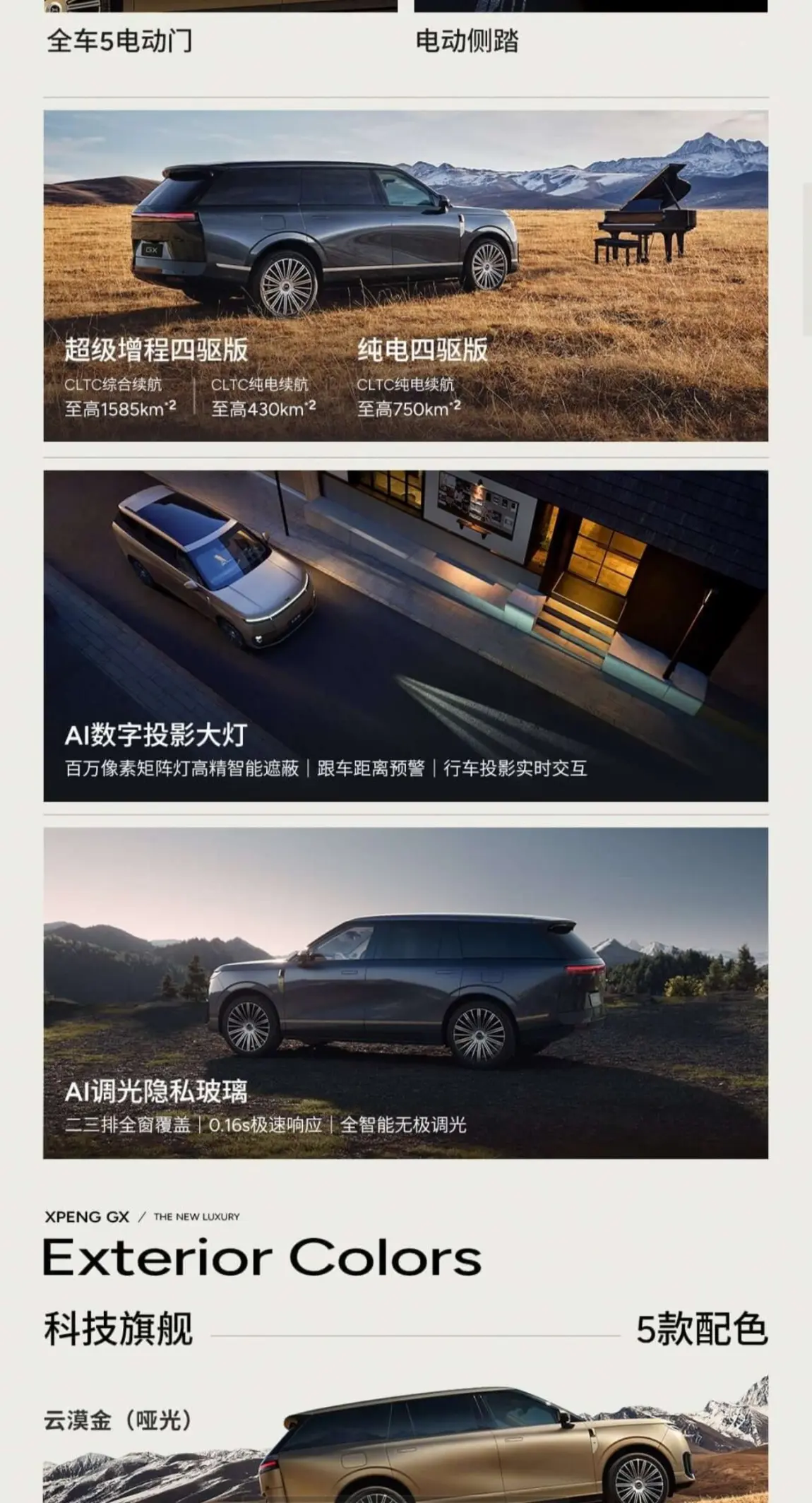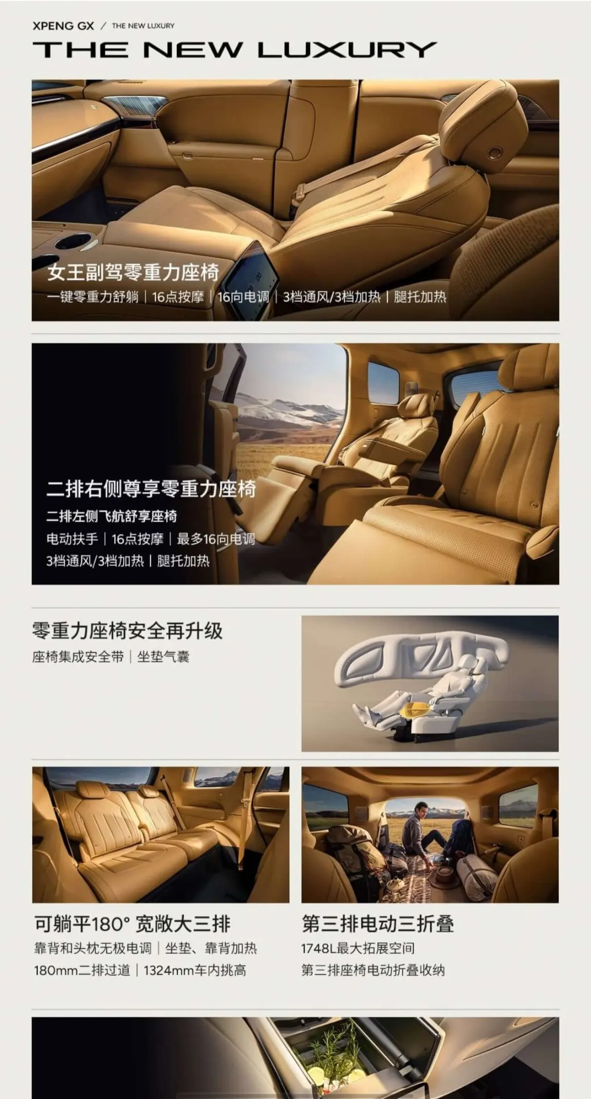 #小鹏GX开启预售# 作为小鹏新一代豪华旗舰,小鹏GX的豪华、舒适、安全、智能化程度在品牌内都达到了新高度。选择预订的理由有以下几点。1. 豪华方面:ai隐私玻璃、24k陶瓷金标大气又不张扬、蚌式机盖尽显霸气、悬浮中控科技感十足。2. 舒适方面:零重力座椅、三排电动折叠、二排娱乐屏、车载冰箱应有尽有。3. 安全方面:城堡式的车身架构,一体全铝压铸车身,多方位碰撞依旧能保证乘客安全。4. 智能化方面:搭配四图灵芯片,算力高达3000tops。搭载第二代vla,智驾能力毋庸置疑