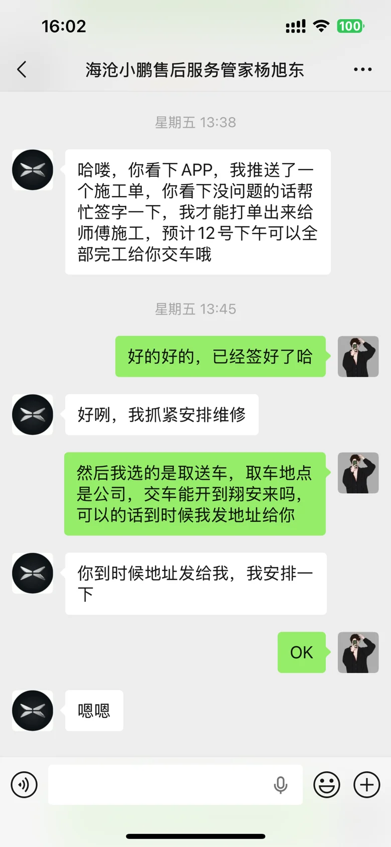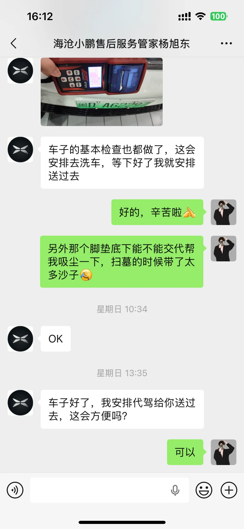 小鹏售后服务一如既往的优秀,从预约到服务结束都保持着专业的服务标准。特别要感谢咱们服务管家杨经理,车子在节假日出问题,第一时间响应并给出解决方案。耐心又积极解答我的问题,车子其他地方有掉漆,也在得到我同意后额外帮我补救处理,结果让我非常满意。整个维修服务过程非常负责,点赞👍👍👍