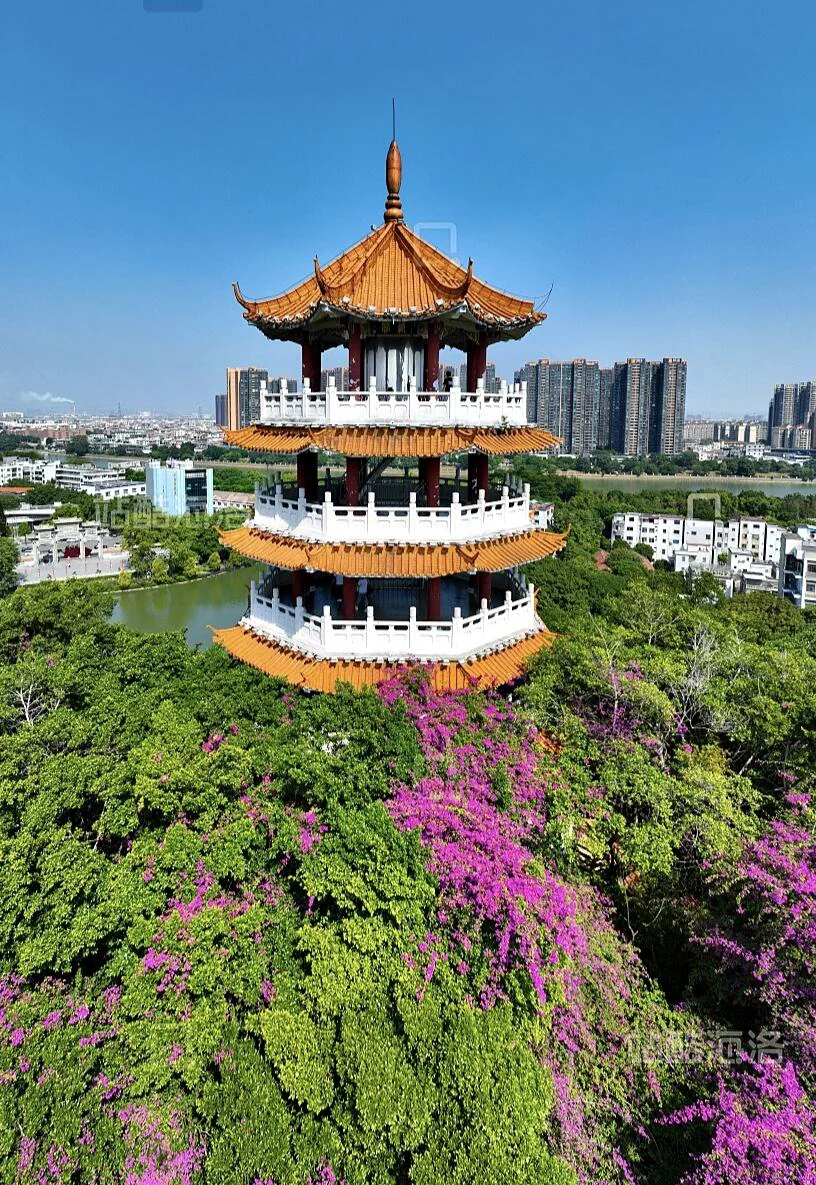 公园深处藏着一座绝美的中式塔楼!红柱灰瓦被粉花绿叶包围,古今建筑碰撞出超魔幻的感觉,手机随便拍都是古风大片,汉服姐妹直接冲!