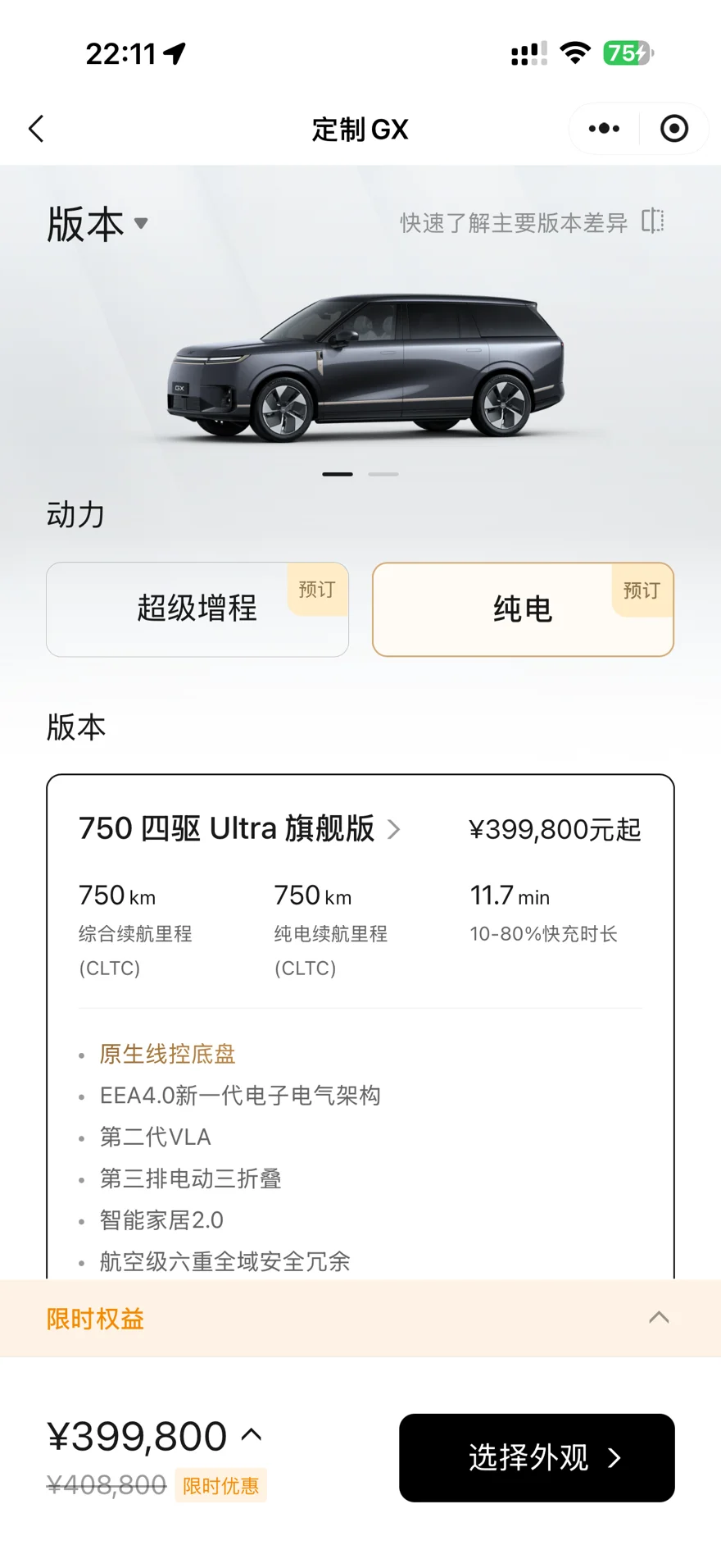 而选择纯电750km续航四驱版,更是让这份期待锦上添花。CLTC 750km的超长续航,覆盖日常通勤、短途出游,一周一充毫无压力;800V高压平台+5C超充,充电12分钟就能补能500km,长途出行补能高效,再也不用为续航焦虑;双电机四驱430kW的最大功率,零百加速4秒级的强劲动力,让日常超车、爬坡都游刃有余。相比增程版,纯电的静谧性与低用车成本,更契合我长期的用车需求。